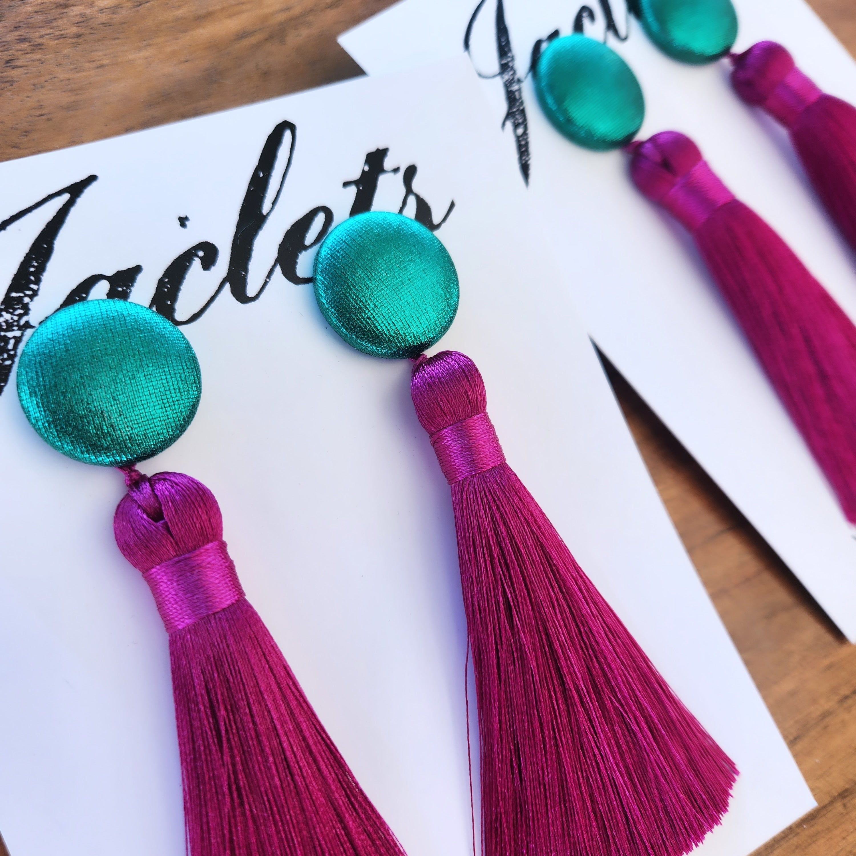 Such a stunning pair! Emerald fabric with fuchsia pink tassels. They're lightweight and lovely, and they have surgical steel post and backing.