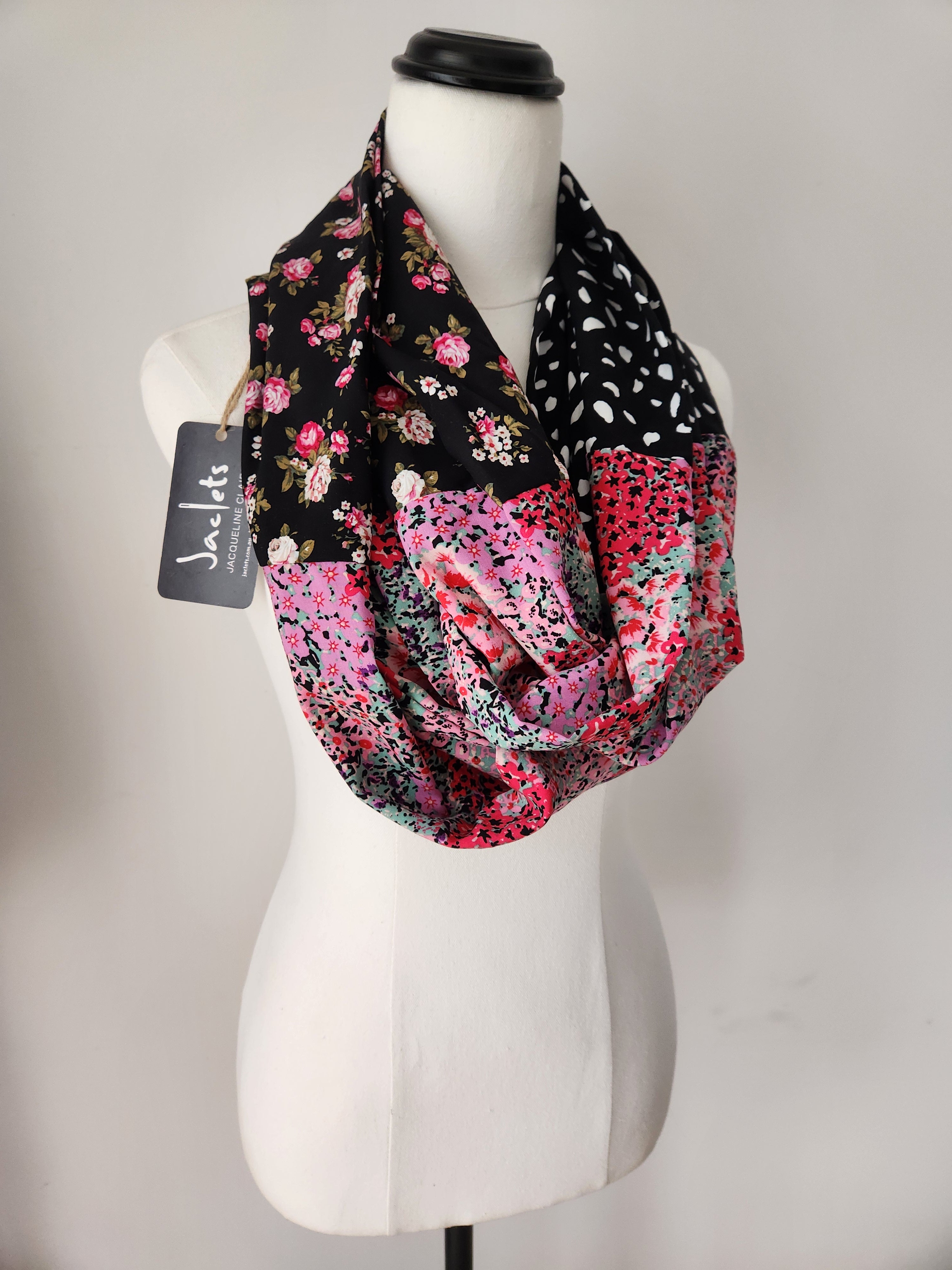 This one of a kind piece is made from 3 prints in pink with black and white. It's made from light soft rayon fabric so its lovely and drapey for the loop shape. The single loop is about 95cm long and gets looped twice around your neck so it looks as pictured when worn. Machine washable in a bra bag and fabric can be ironed. Line dry.