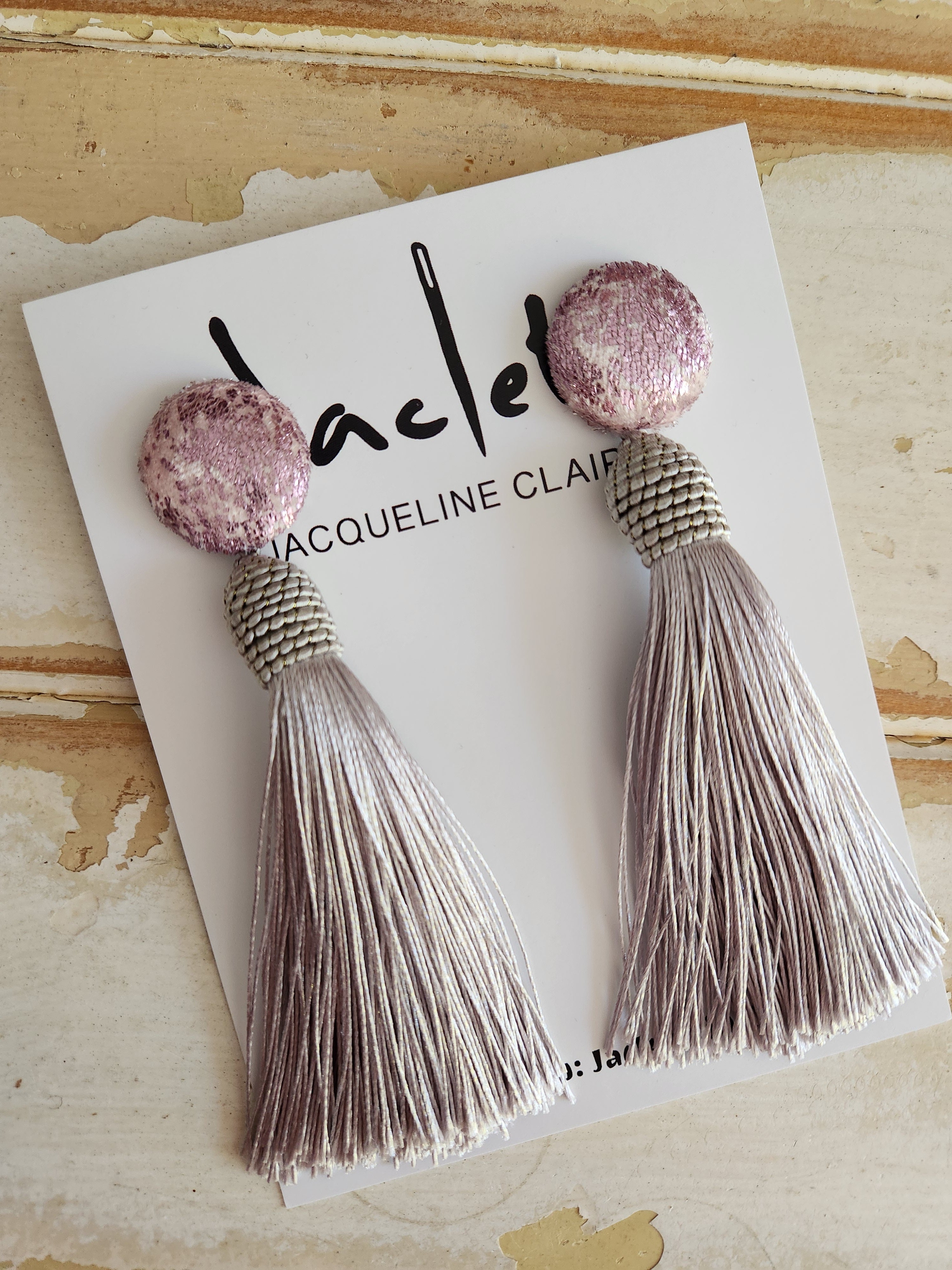 Dusty pink foil-print stud with soft grey tassels, these are a beautiful colour pairing.