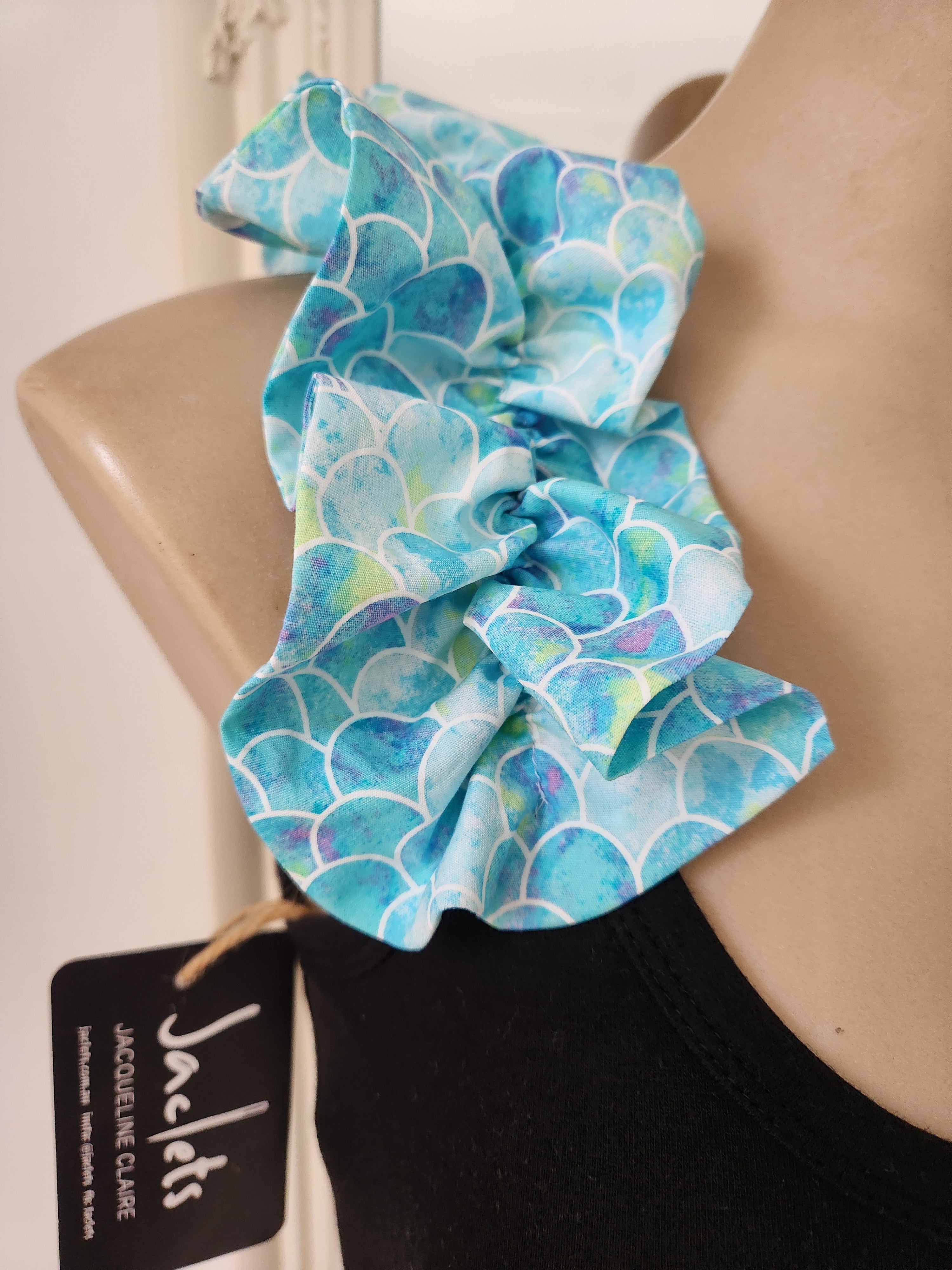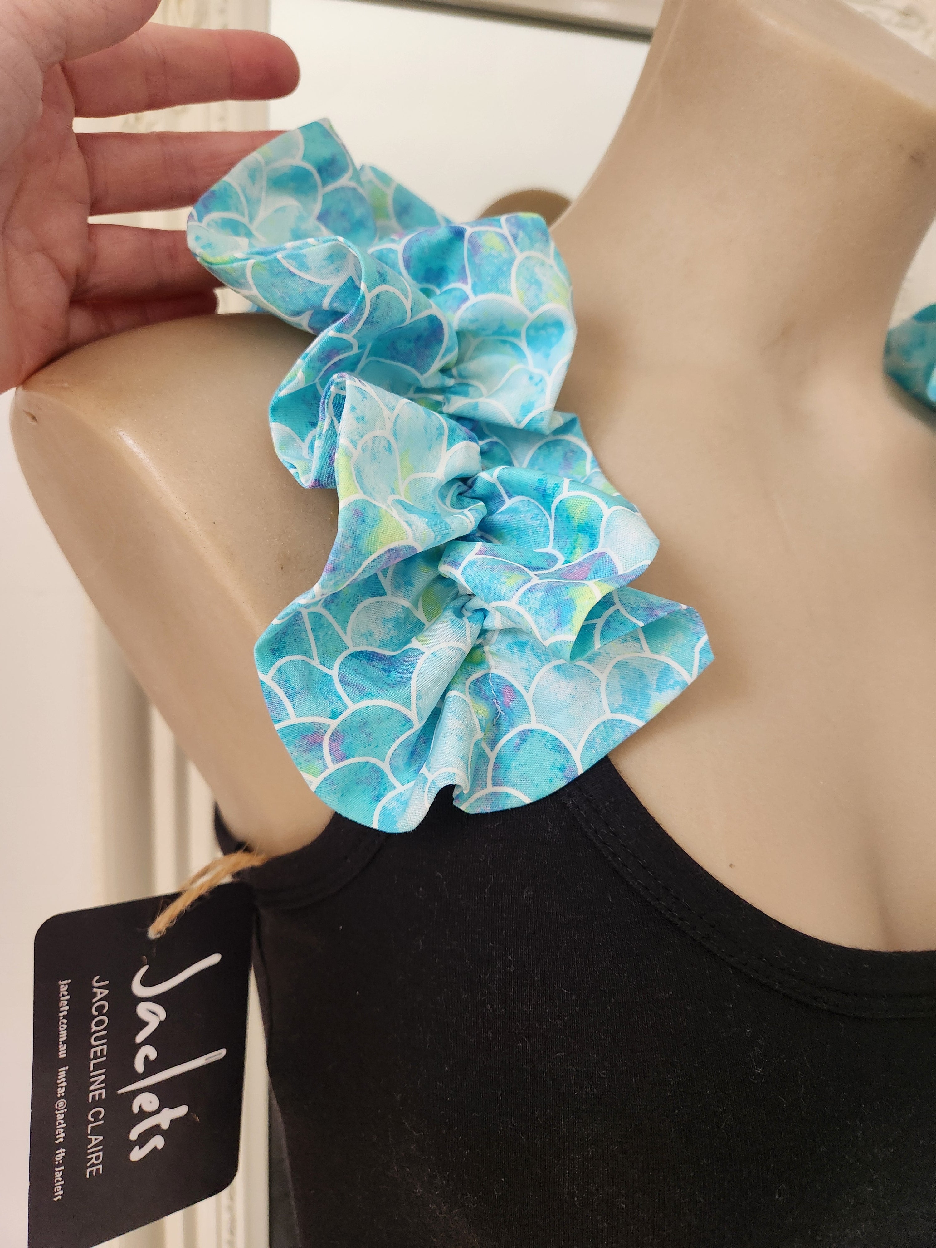 Make a statement without saying a word in this gorgeous handmade top featuring ruffle shoulders in a dreamy mermaid-scale print. The soft aqua and turquoise tones bring a fresh, ocean-kissed vibe.