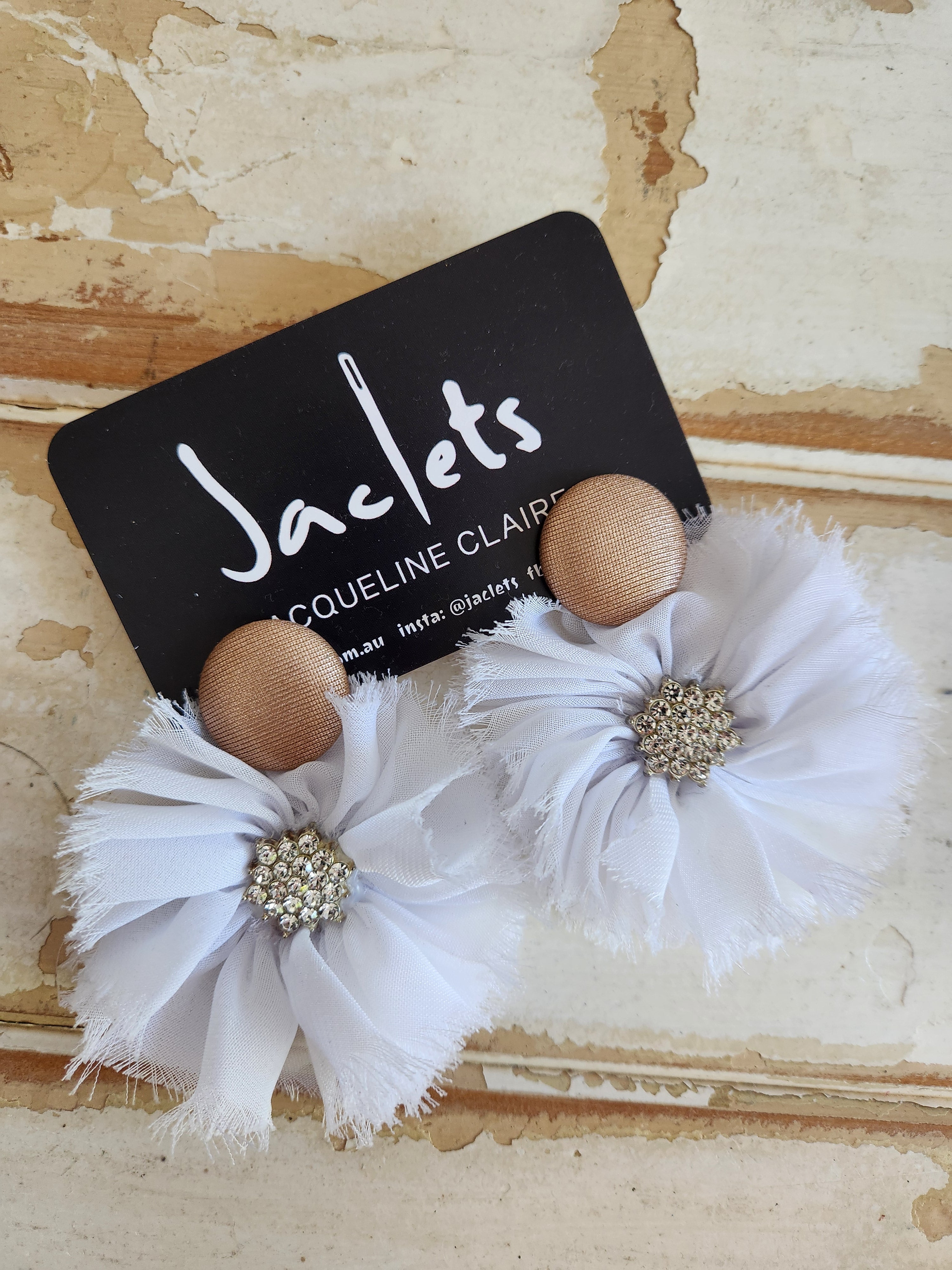 Bronze-gold fabric studs with soft white flowers, they're fun and flirty and will make you feel fabulous! Very lightweight, won't pull your ears down, and total length is 7cm.