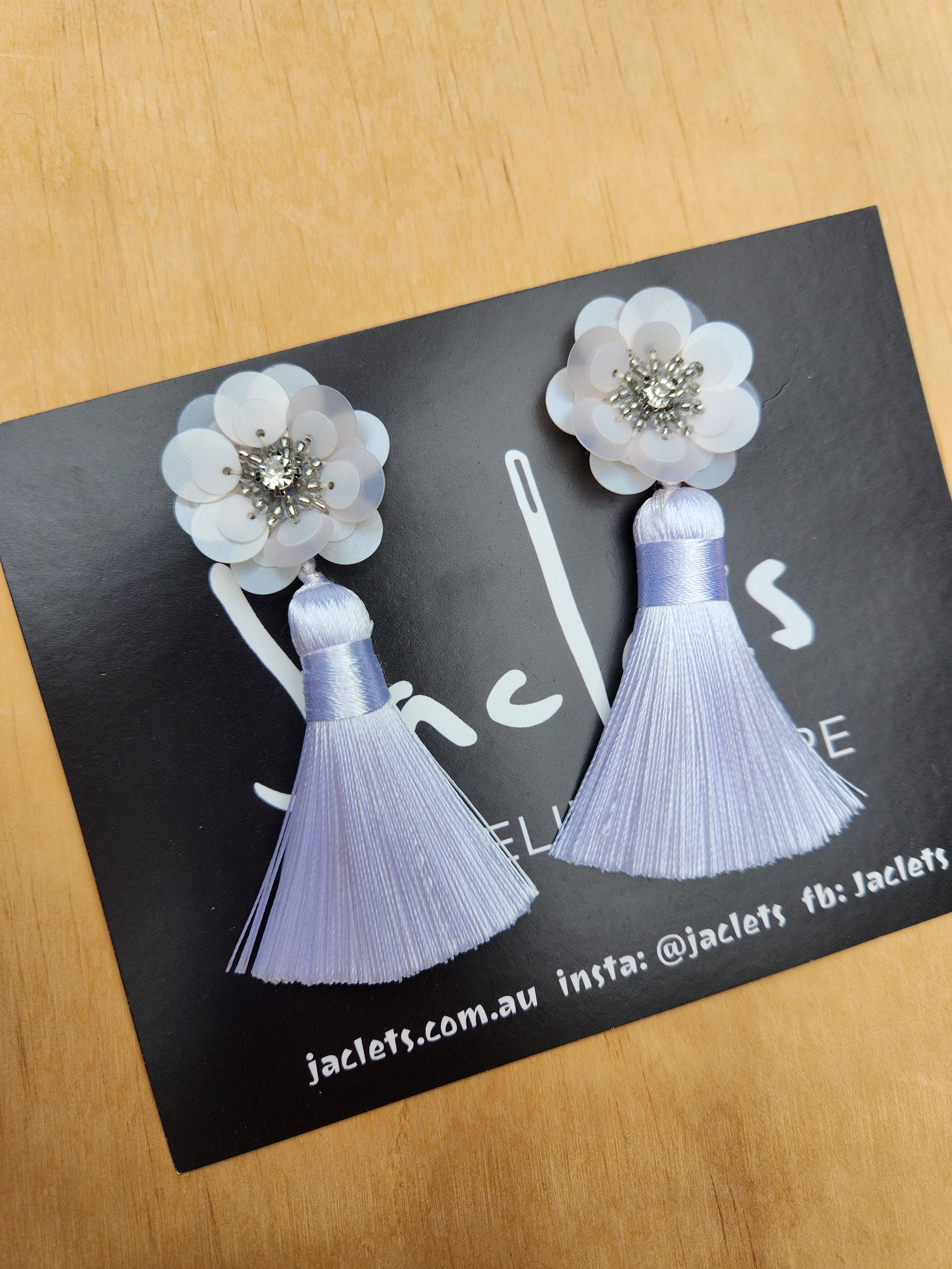 These are a one-of-a-kind pair, and they feel like wearing a Fairytale. They're gorgeous and unusual and will make you feel fabulous. They have gorgeous bead and sequin detail studs, with white tassels.
