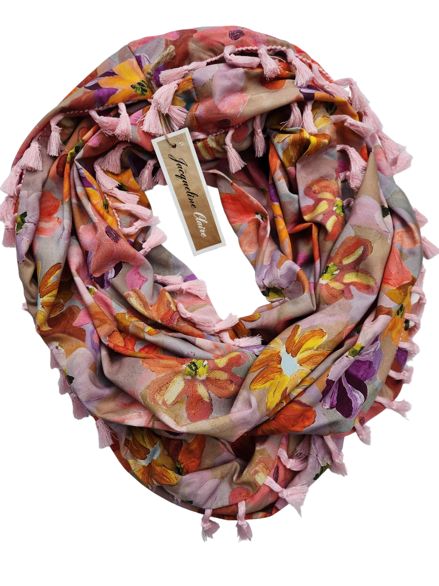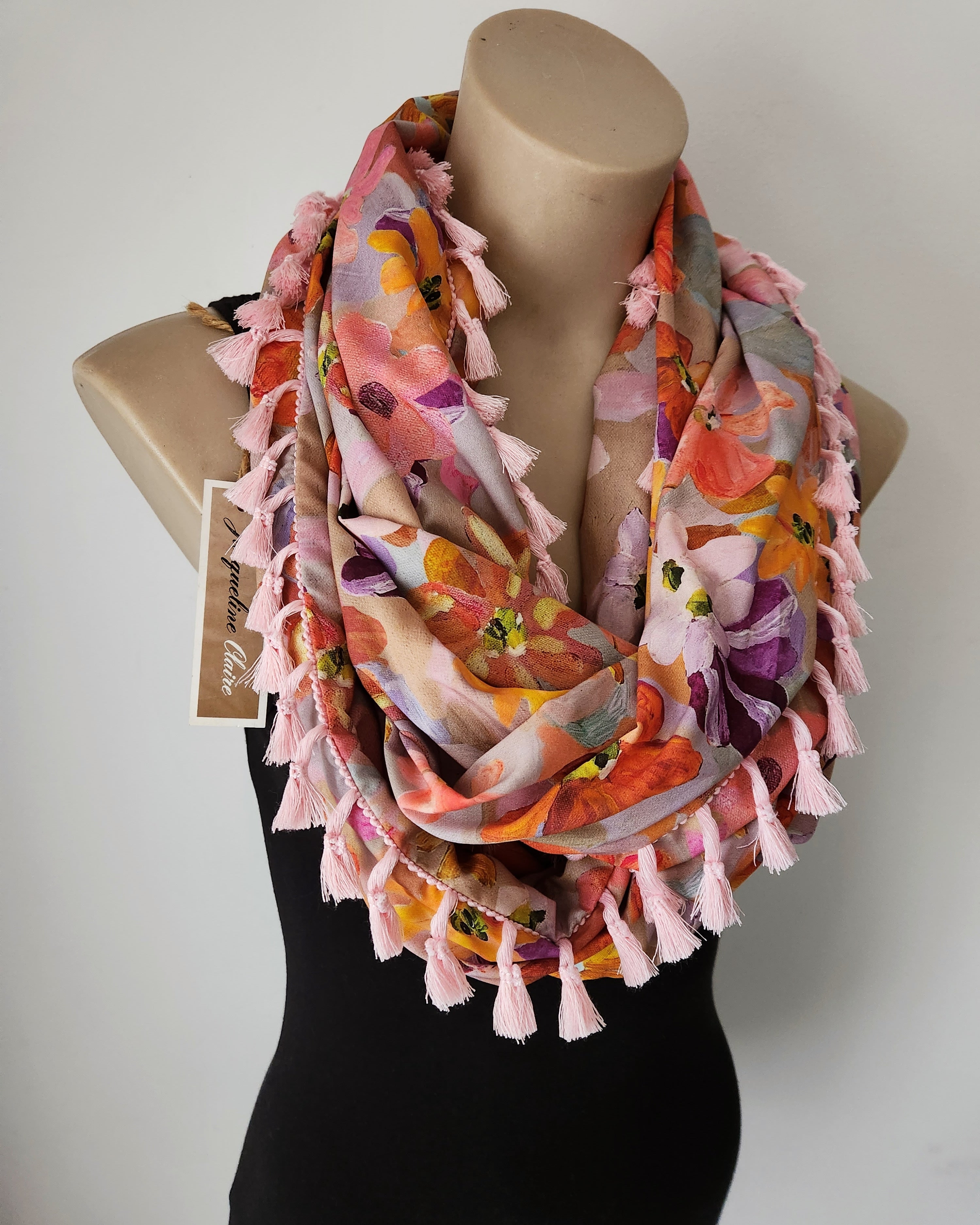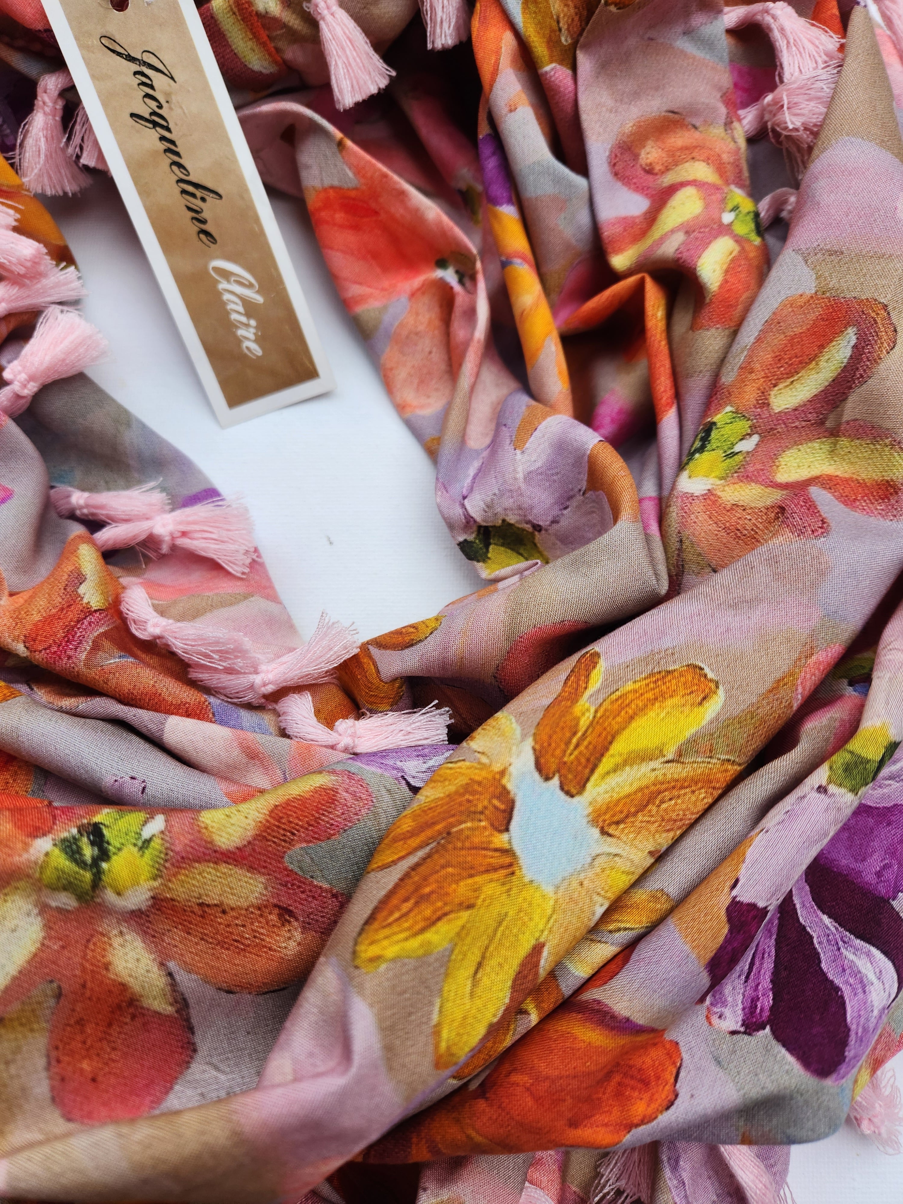 This print is a mix of smokey mochas with pops of pink and orange abstract flowers. It's gorgeous quality rayon fabric so its lovely and drapey for the loop shape. Soft pink cotton tassels finish it off.