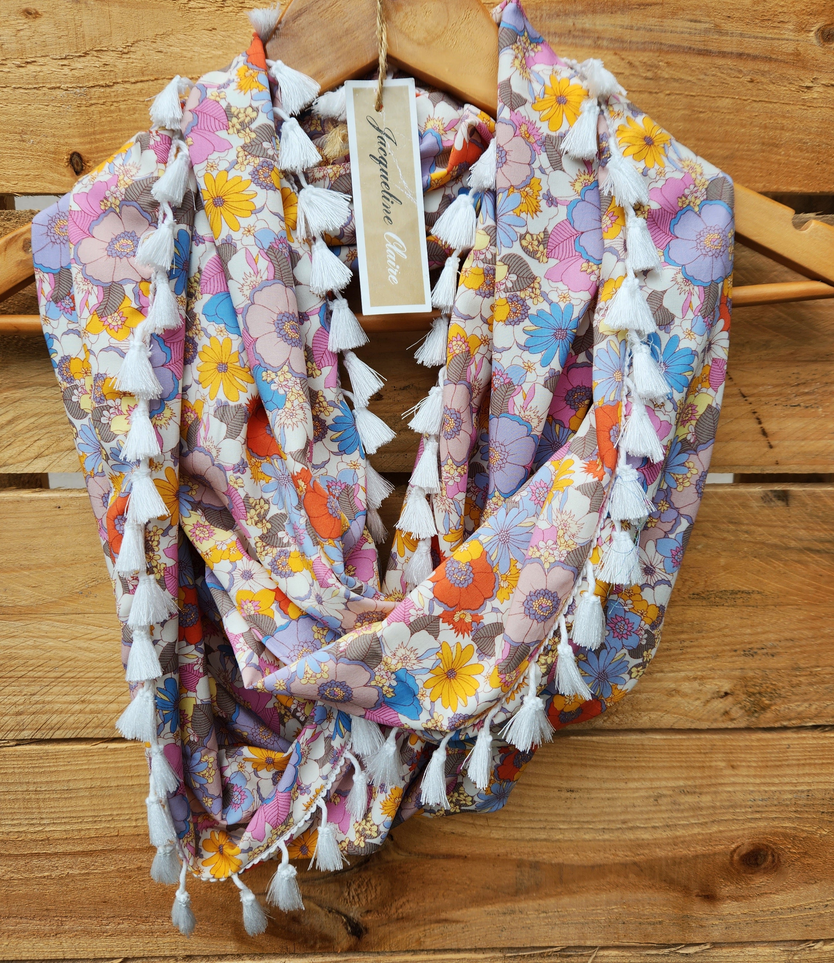 The "Betsy" infinity wrap is made from this fun print of pastel retro flowers and finished with white cotton tassels. It's made from light soft rayon fabric so its lovely and drapey for the loop shape.