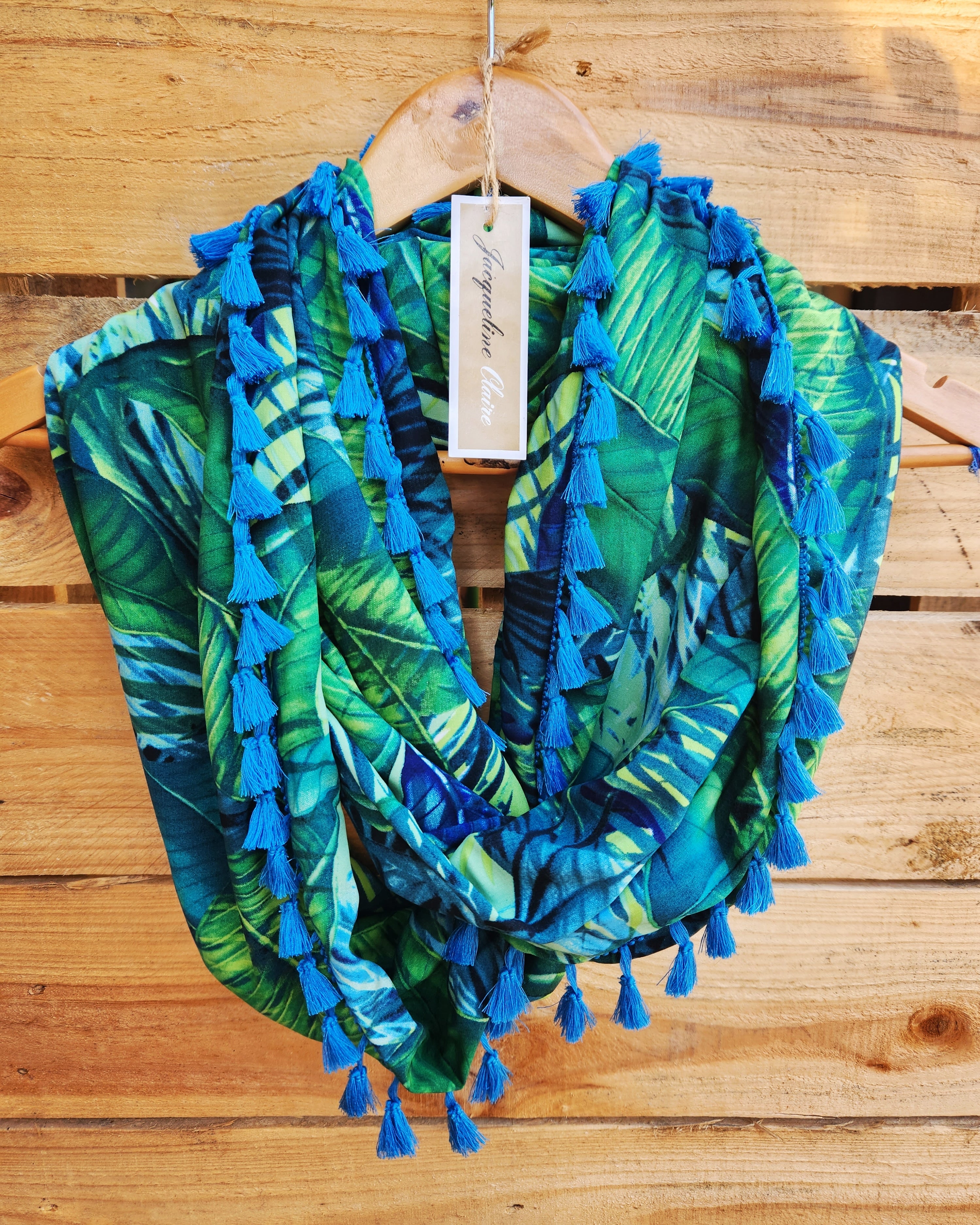 Lush leaf print in blues and greens with blue tassels. Light soft rayon fabric so its nice and drapey. The single loop is about 100cm long and gets looped twice around your neck, as pictured. Machine washable in a bra bag and fabric can be ironed. Line dry.