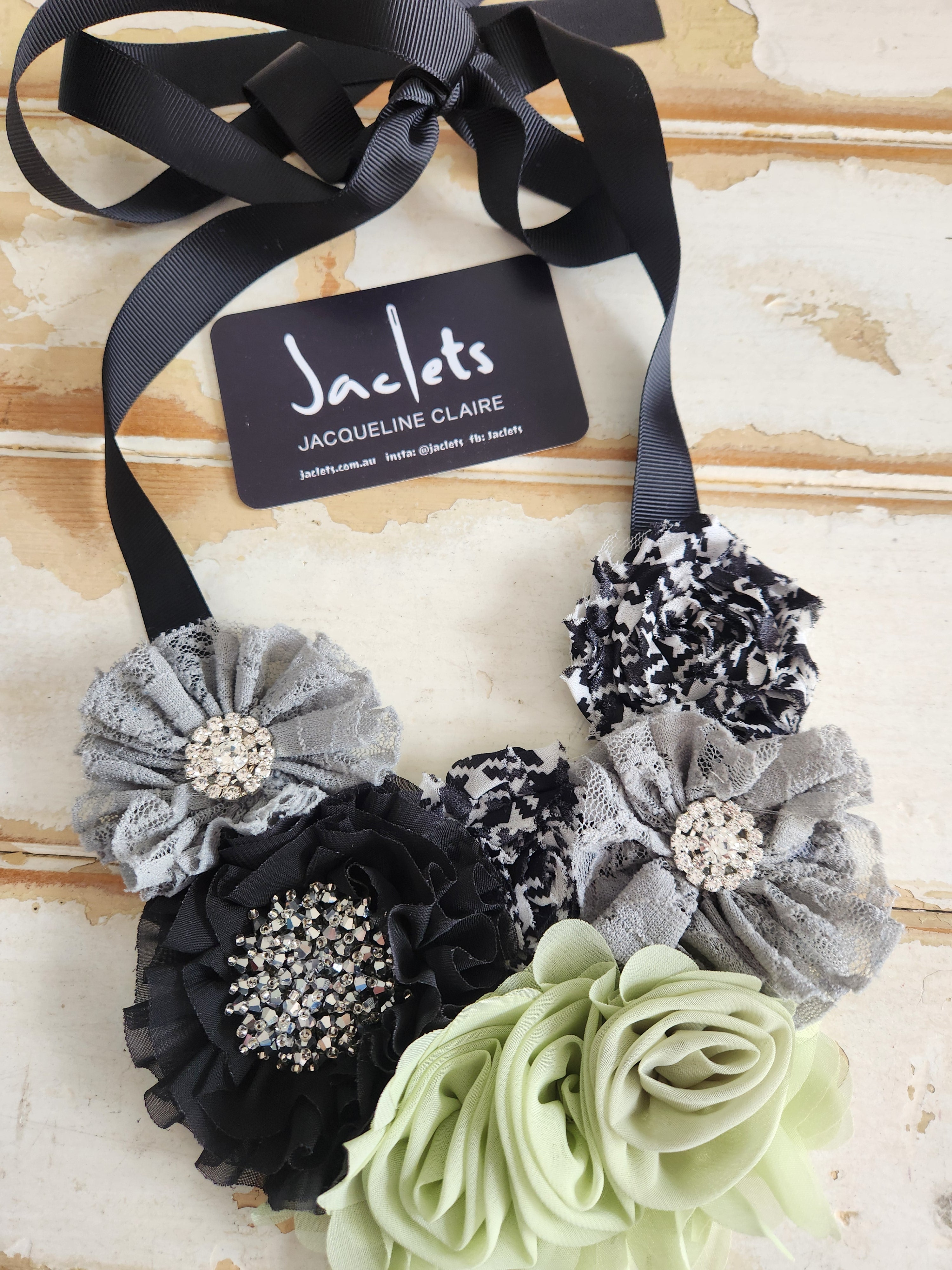 This exquisite handmade statement necklace is designed to turn everyday outfits into something truly special. Black and white, paired with soft green and grey.