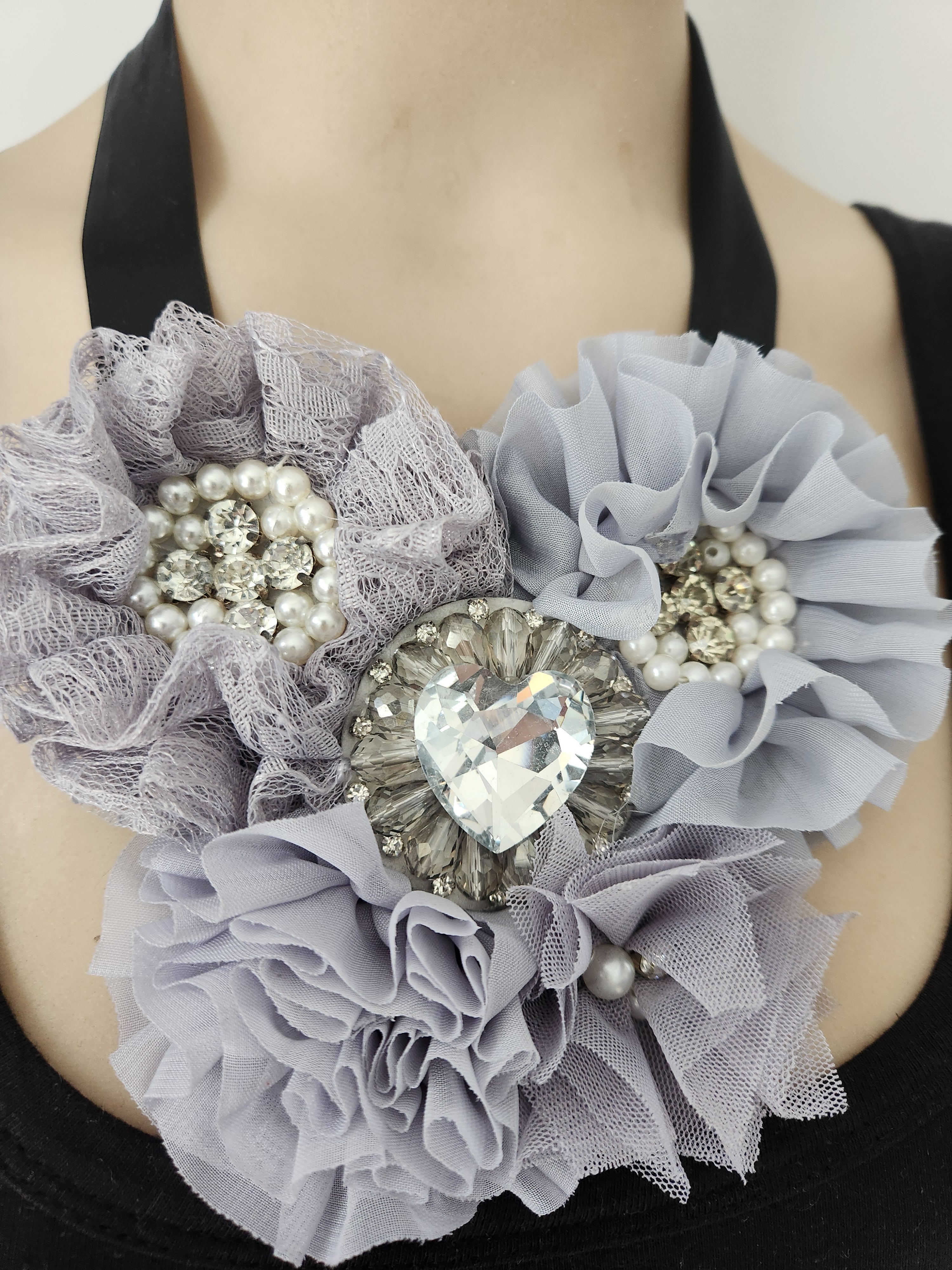 This exquisite handmade statement necklace is designed to turn everyday outfits into something truly special. Featuring soft, layered fabric flowers in elegant grey tones, and a stunning heart-shaped centre jewel for a touch of romance and sparkle.