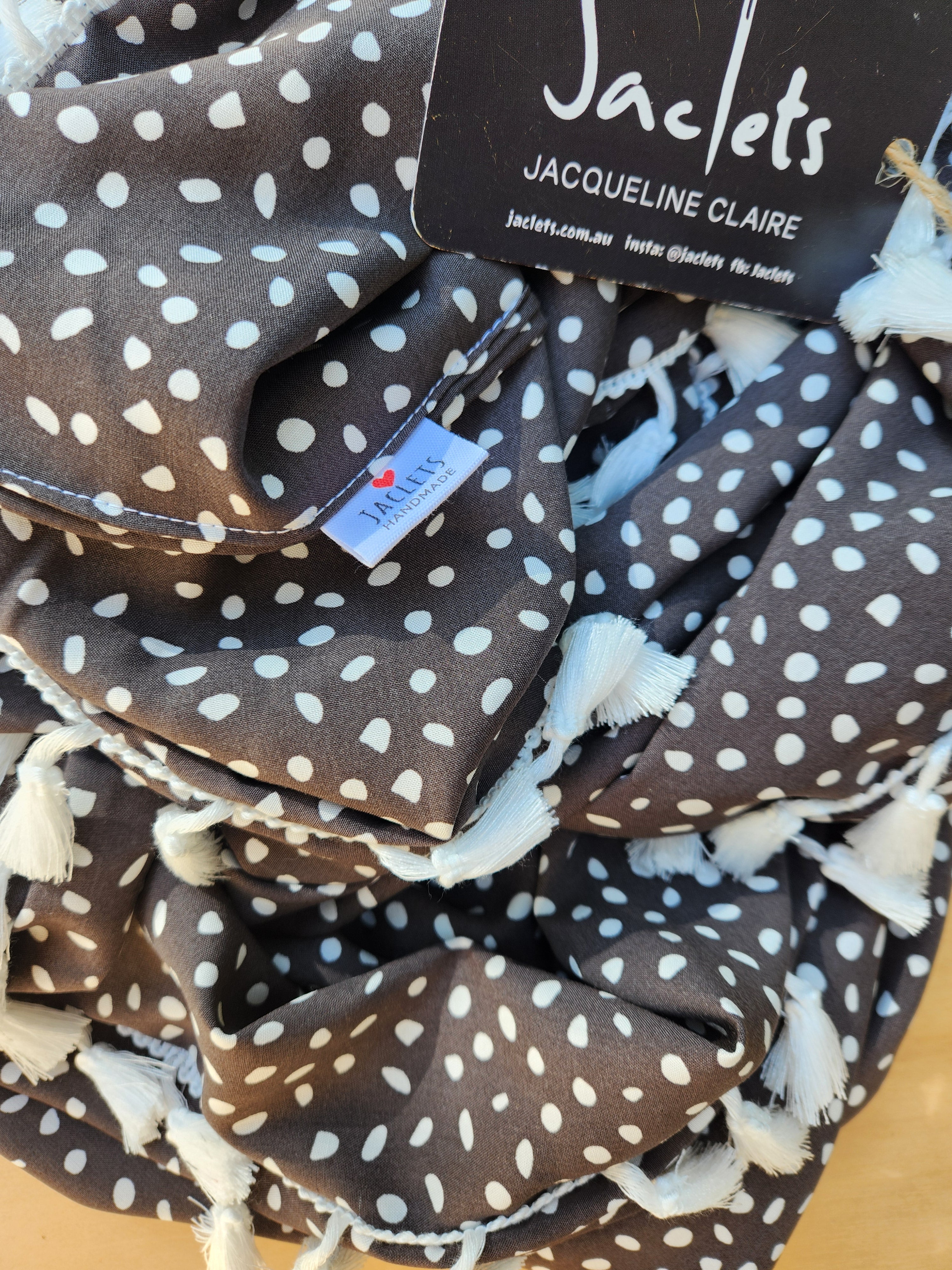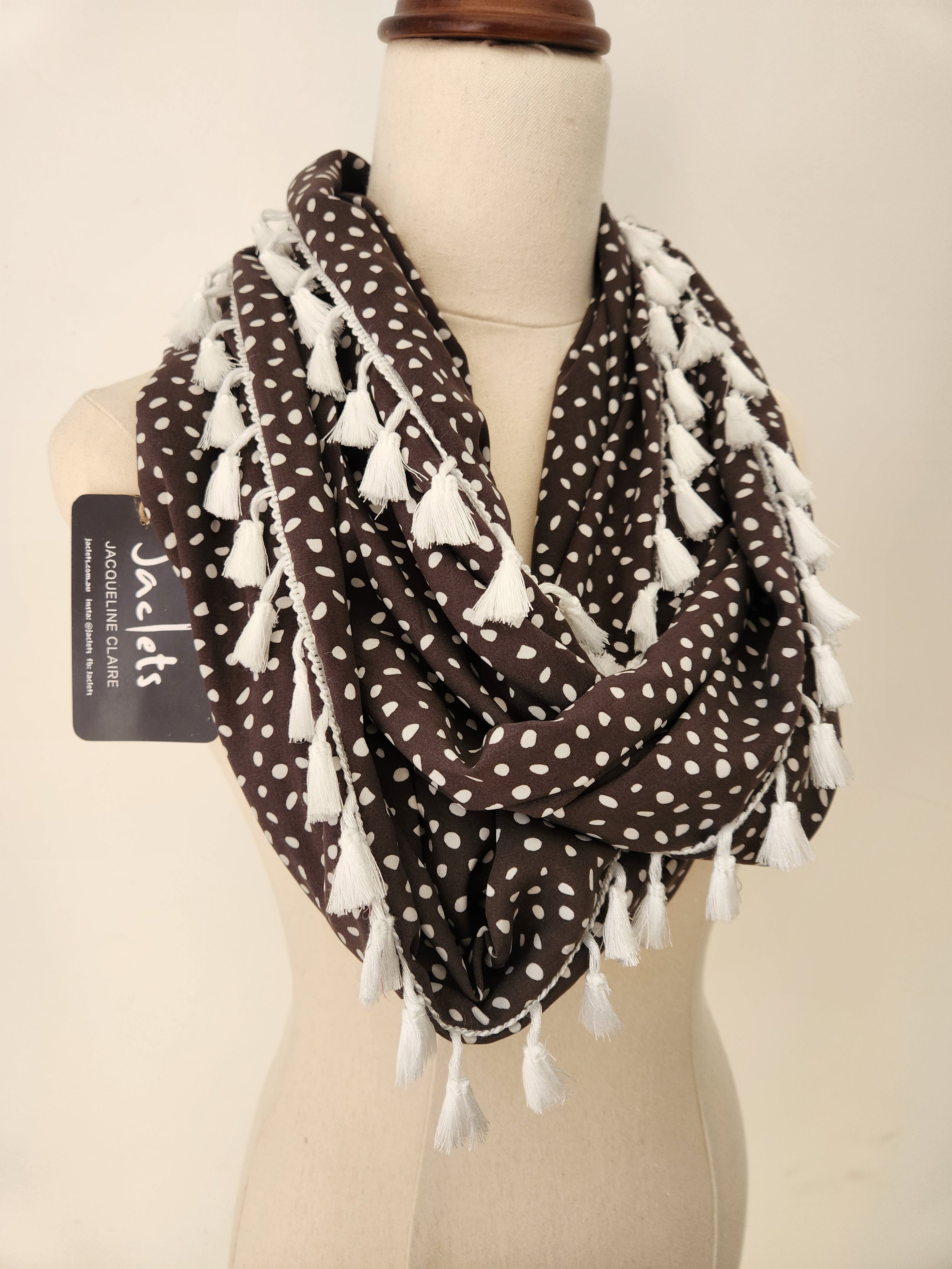 Wrap yourself in playful elegance with this handmade loop scarf in rich cocoa brown, scattered with soft white polka dots and finished with a border of fluffy white cotton tassels. Effortlessly chic and endlessly wearable, it adds a touch of charm to any outfit — from weekend denim to a sharp white shirt or flowing summer dress.