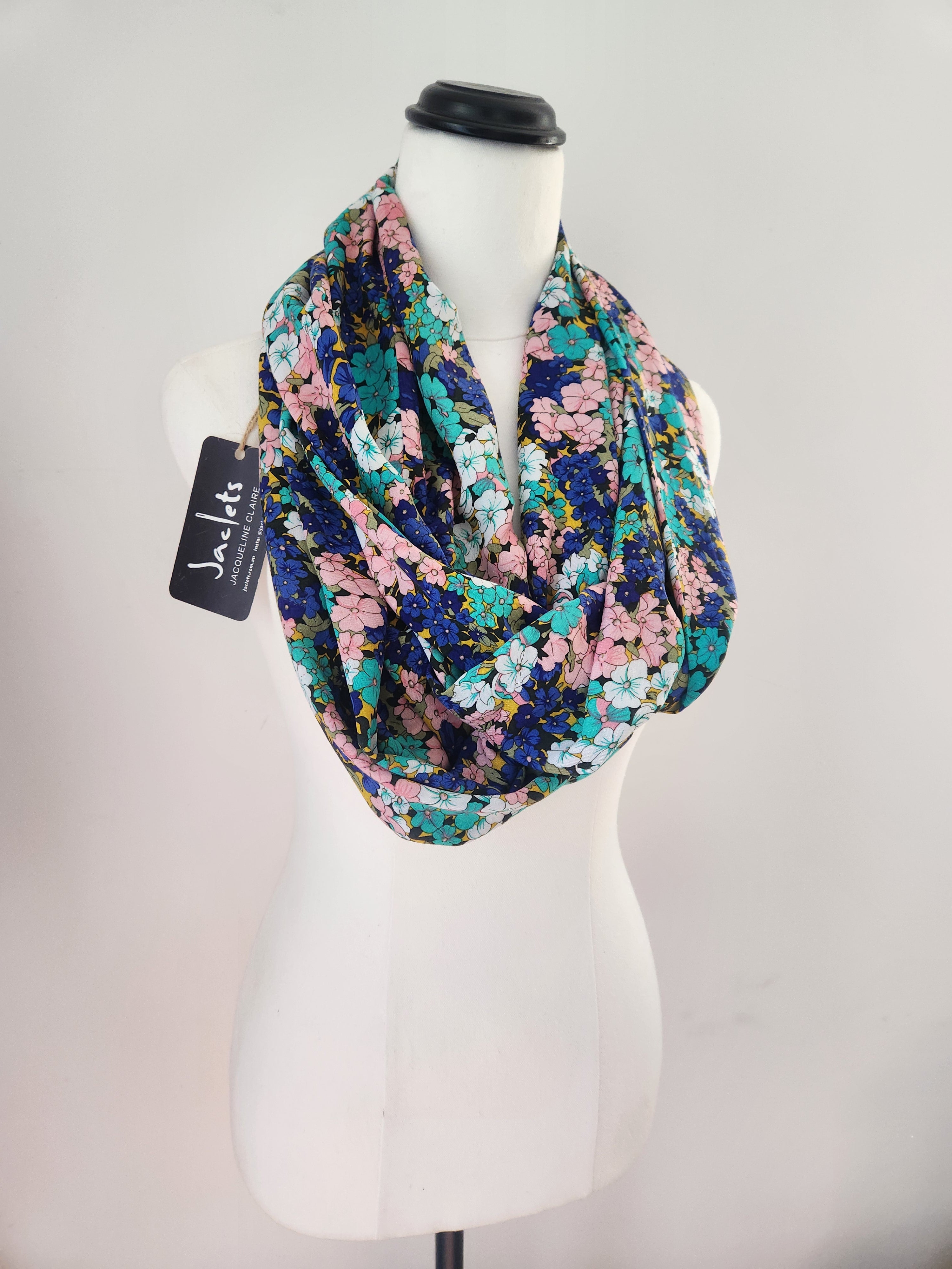It's light soft rayon fabric so its lovely and drapey for the loop shape. The single loop is about 95cm long and gets looped twice around your neck so it looks as pictured when worn. Machine washable in a bra bag and fabric can be ironed. Line dry.