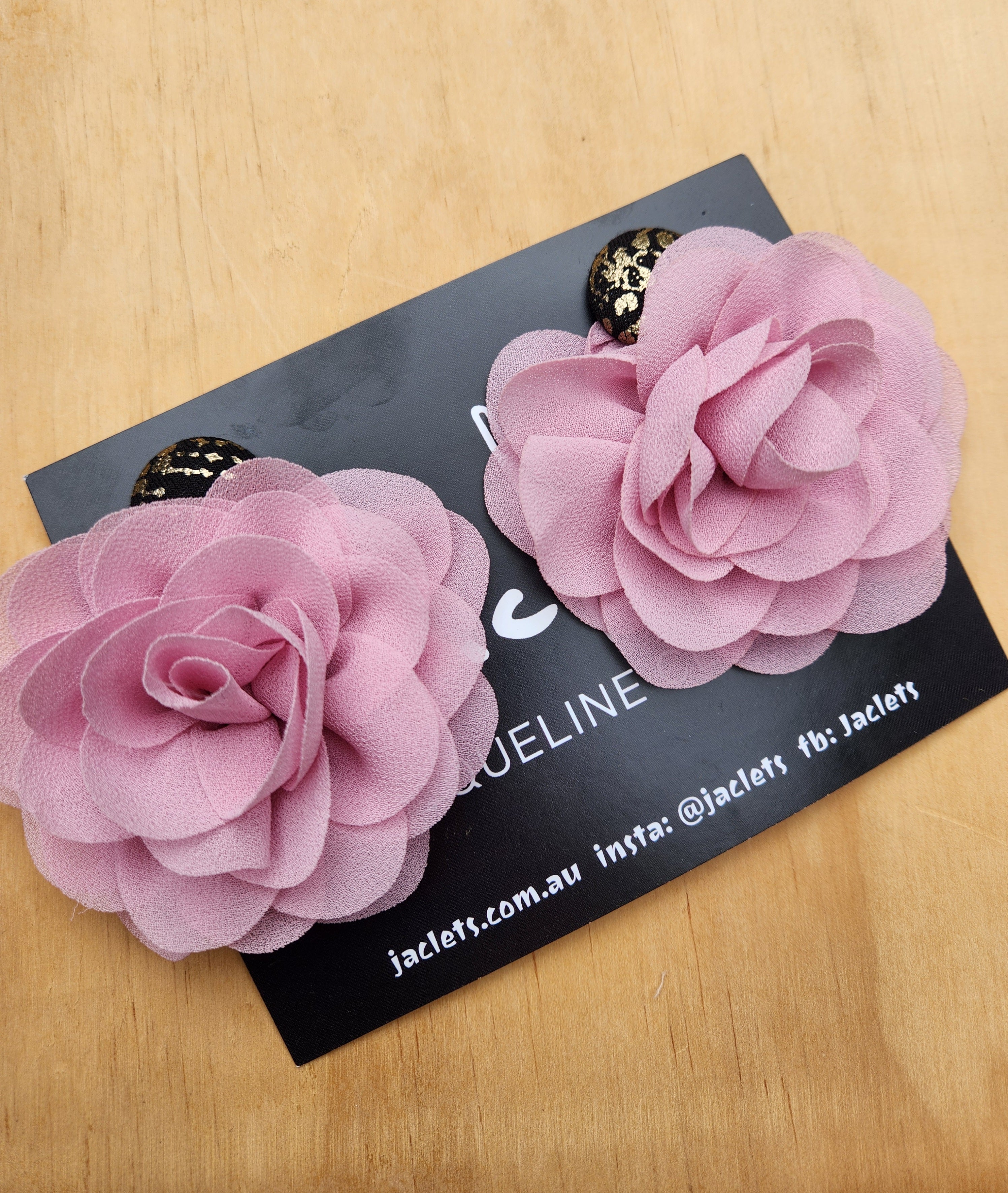 Handmade in Brisbane, they're about 9cm long, super lightweight, and they have surgical steel post and backing. Black and pewter print stud with pink fabric flower.
