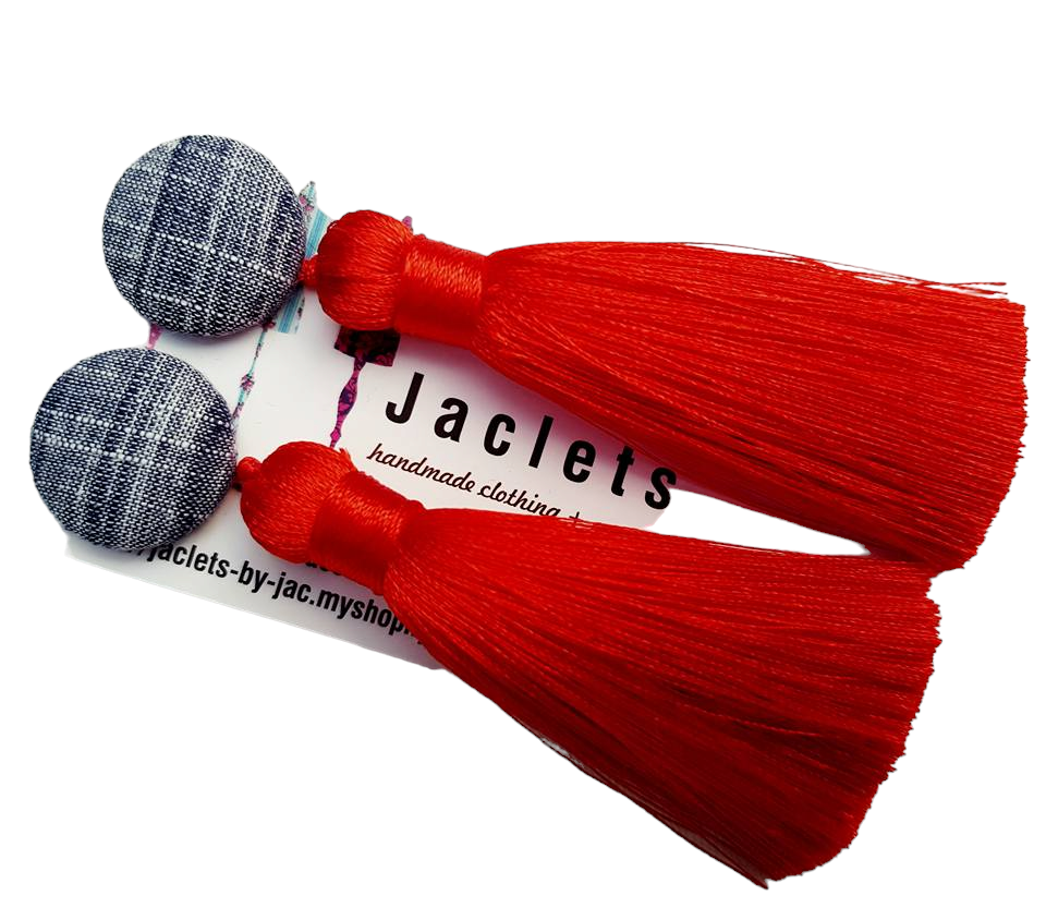 Denim stud with gorgeous red tassels. Lovely and light, about 9cm long.