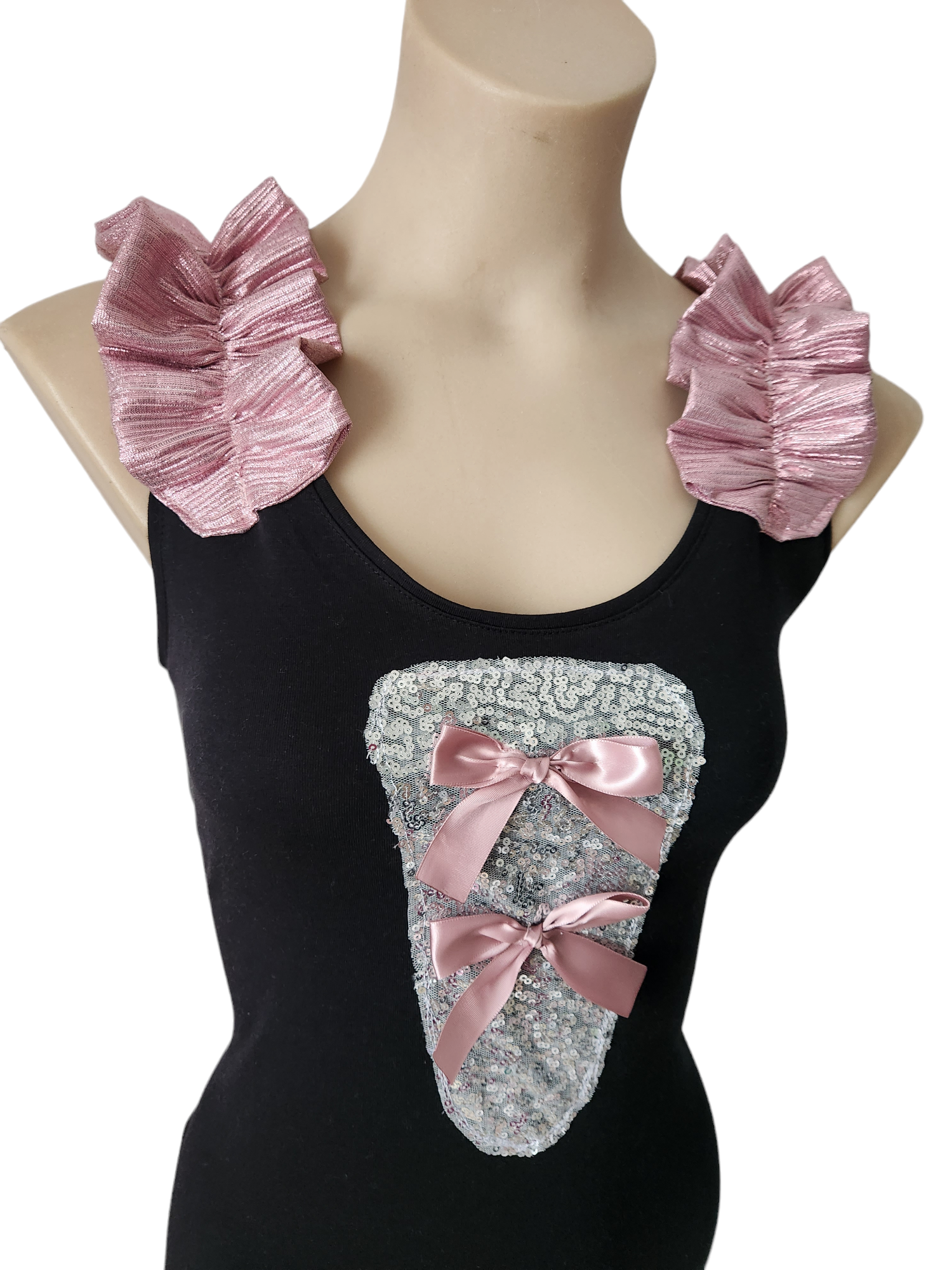 The focus of this top are the gorgeous pink-sheen handmade shoulder ruffles and silver sequins and bow detail. It's a perfect top to wear with jeans, a high-waisted skirt or pants, or shorts. Add a necklace or earring, and you're fancy and fabulous!