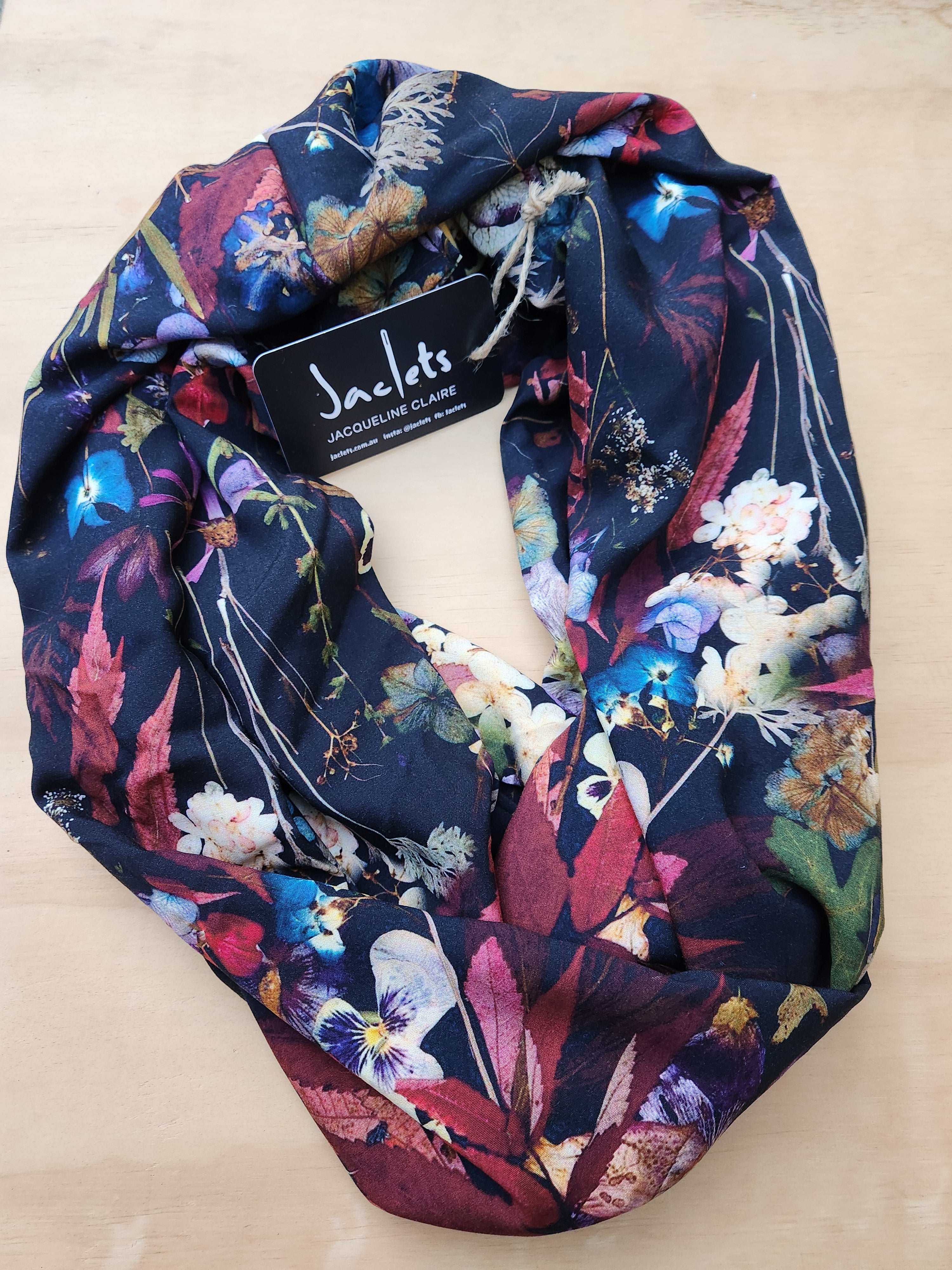 Dark indigo with burgundy and pops of colour through this pansy floral print. Perfect with black, white, denim or pick a colour in the wrap and wear a plain coloured top in the same shade.