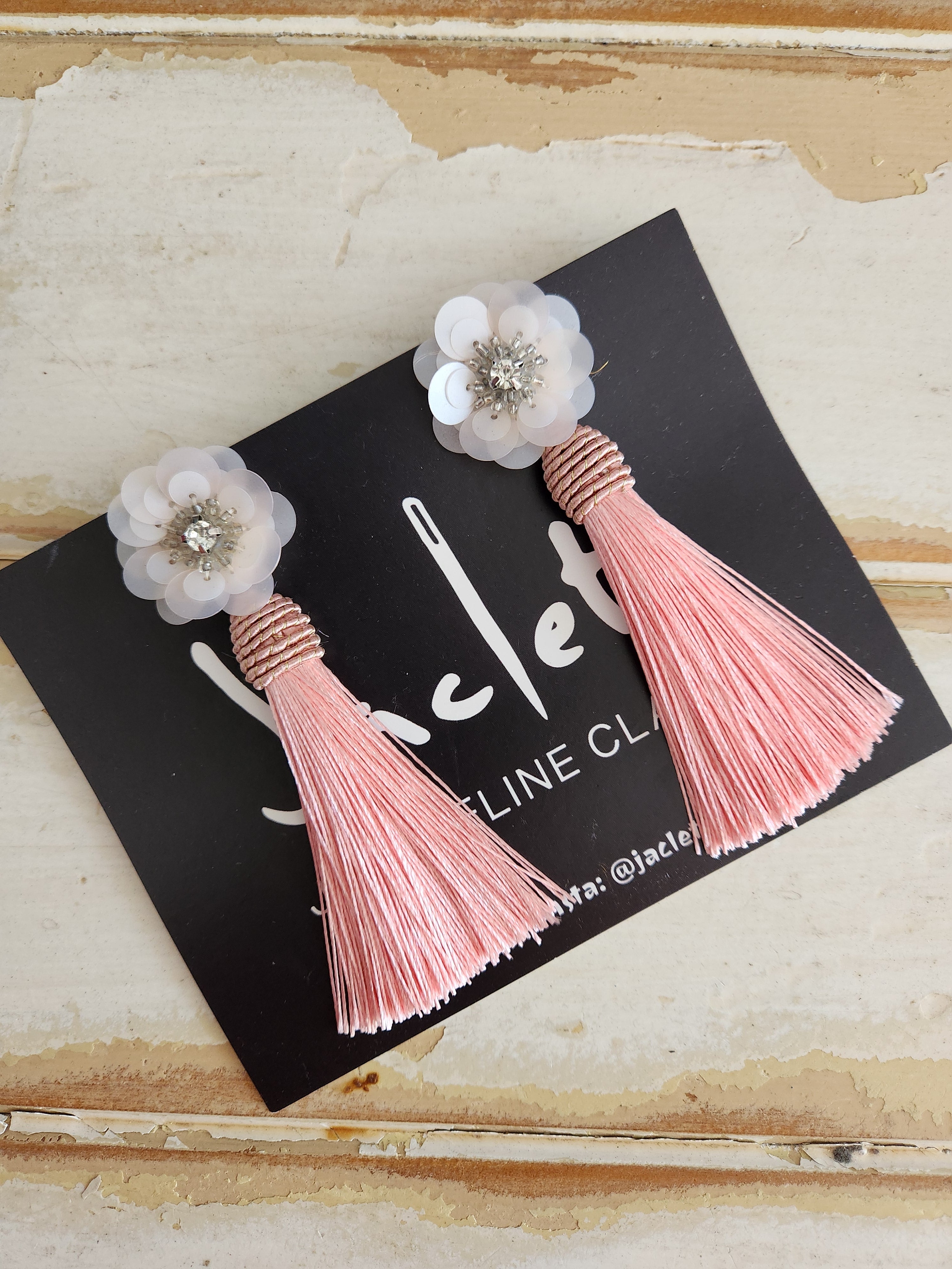 These are a one-of-a-kind pair, and they feel like wearing a Fairytale. They're gorgeous and unusual and will make you feel fabulous. They're strawberry-pink tassels with bead and sequin detail.
