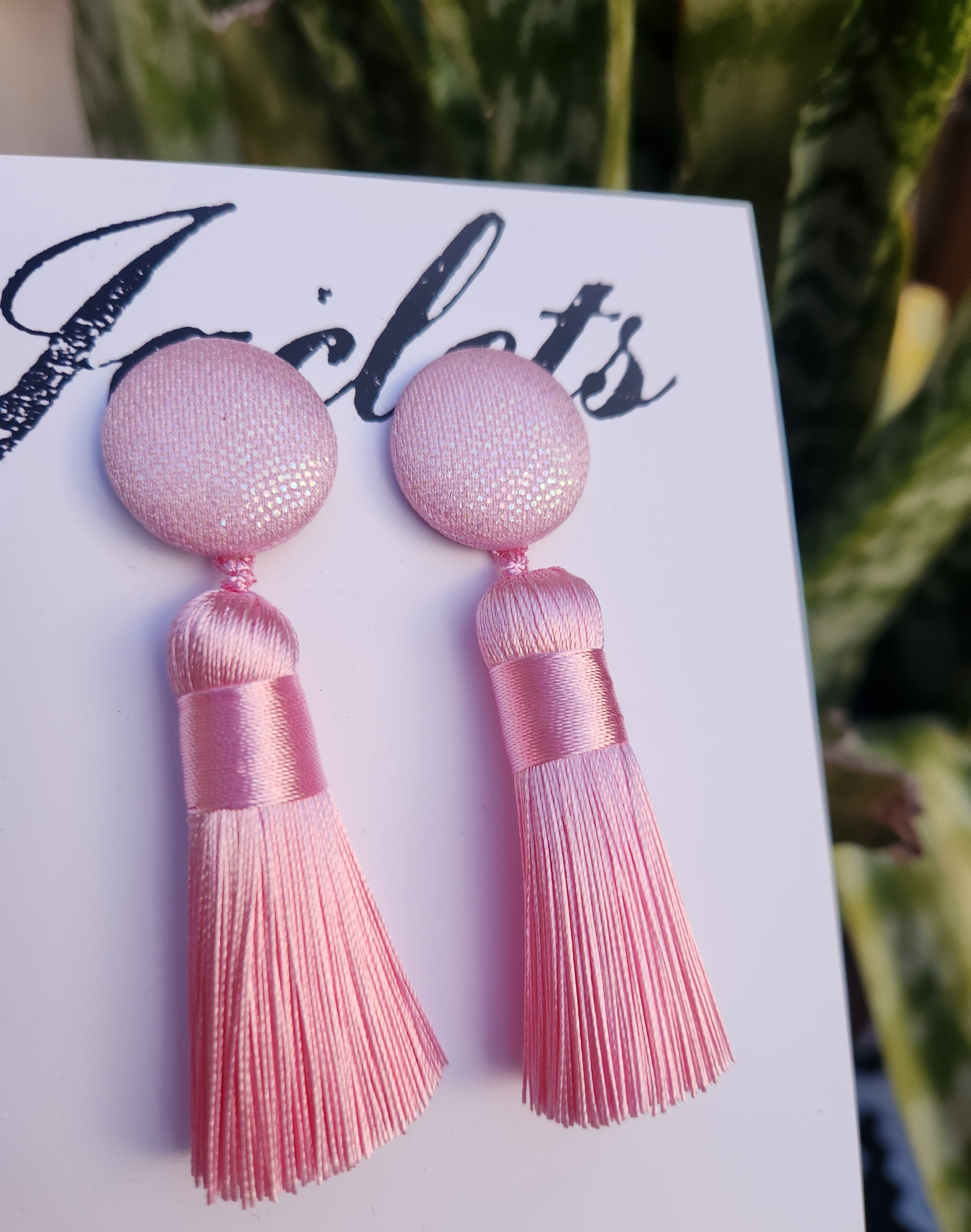 Baby pink iridescent fabric stud with matching baby pink tassels, such an adorable set of earrings, perfect for a pink-lover!