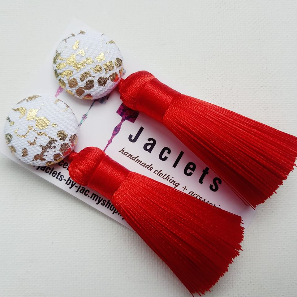 White and gold print stud with red tassels. Total length about 8cm, nice and lightweight, surgical steel backing.