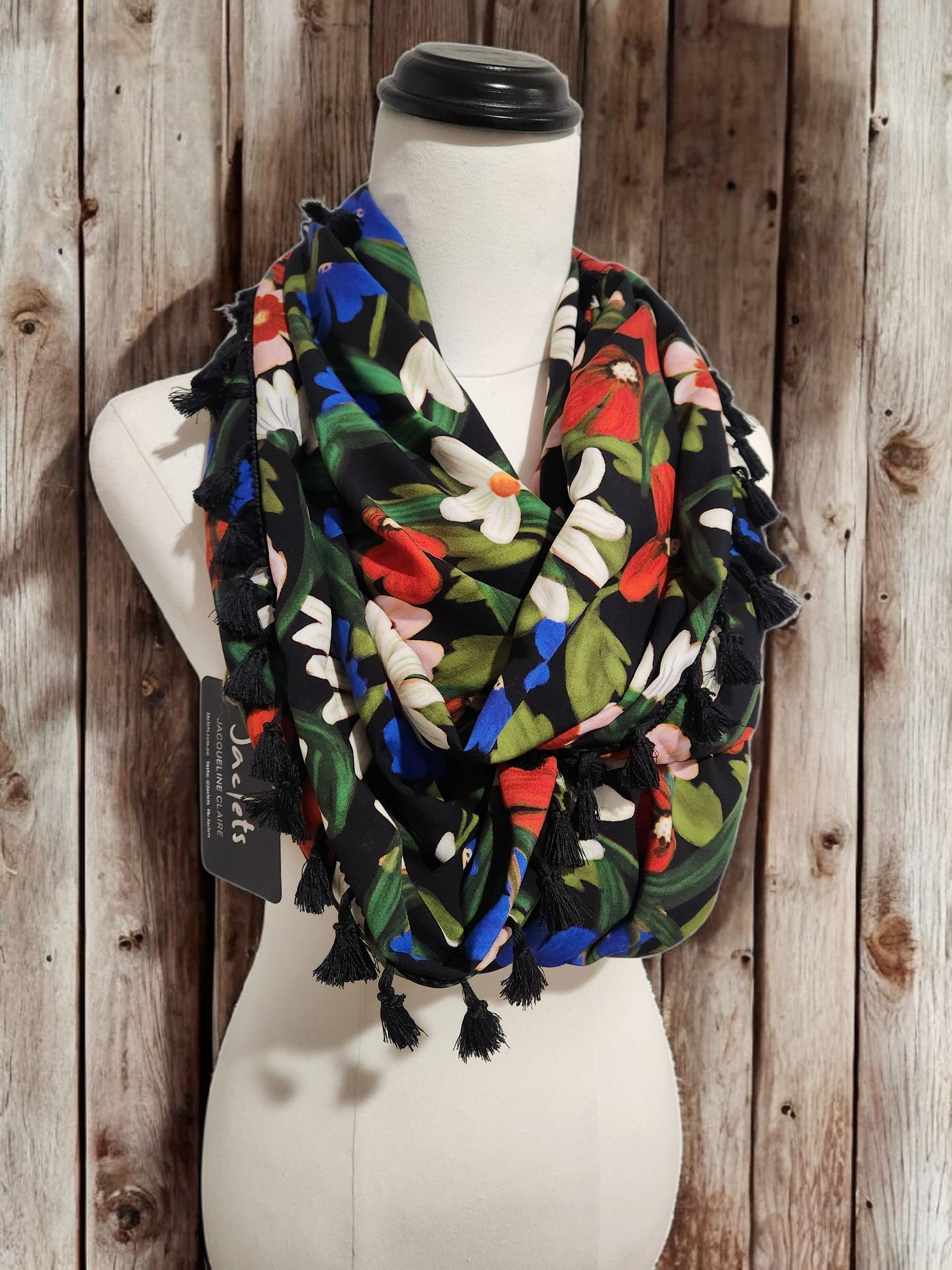 Black with vibrant flower print in cobalt, bright red and green, and finished off with black cotton tassels. This piece will get you all the compliments! It's made from light soft rayon fabric so its lovely and drapey for the loop shape. The single loop is about 100cm long and gets looped twice around your neck so it looks as pictured when worn. Machine washable in a bra bag and fabric can be ironed. Line dry.