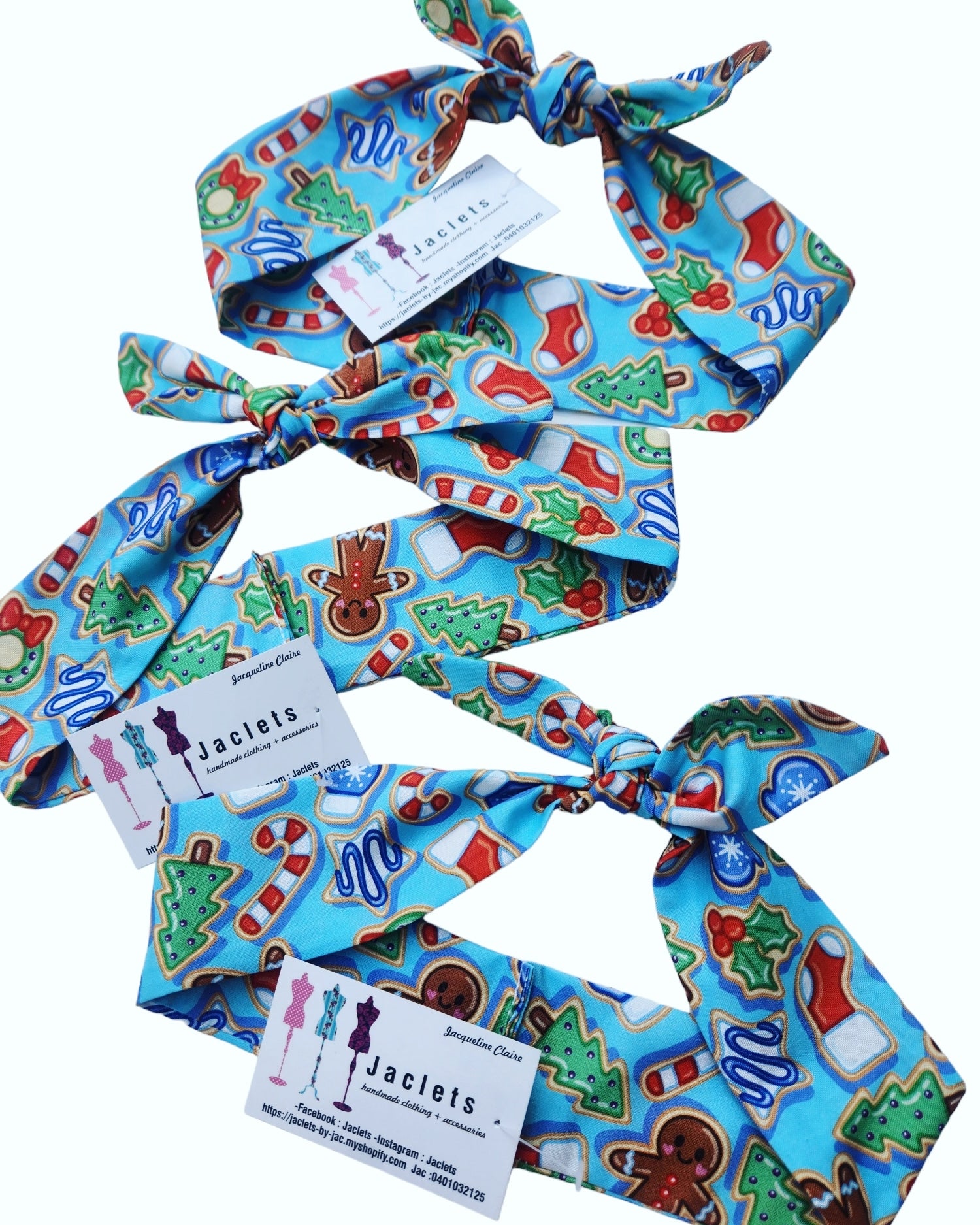 Pretty mid-blue with coloured Christmas print of cookies, trees and gingerbreads. It ties up to fit your head, wear with hair up or down.