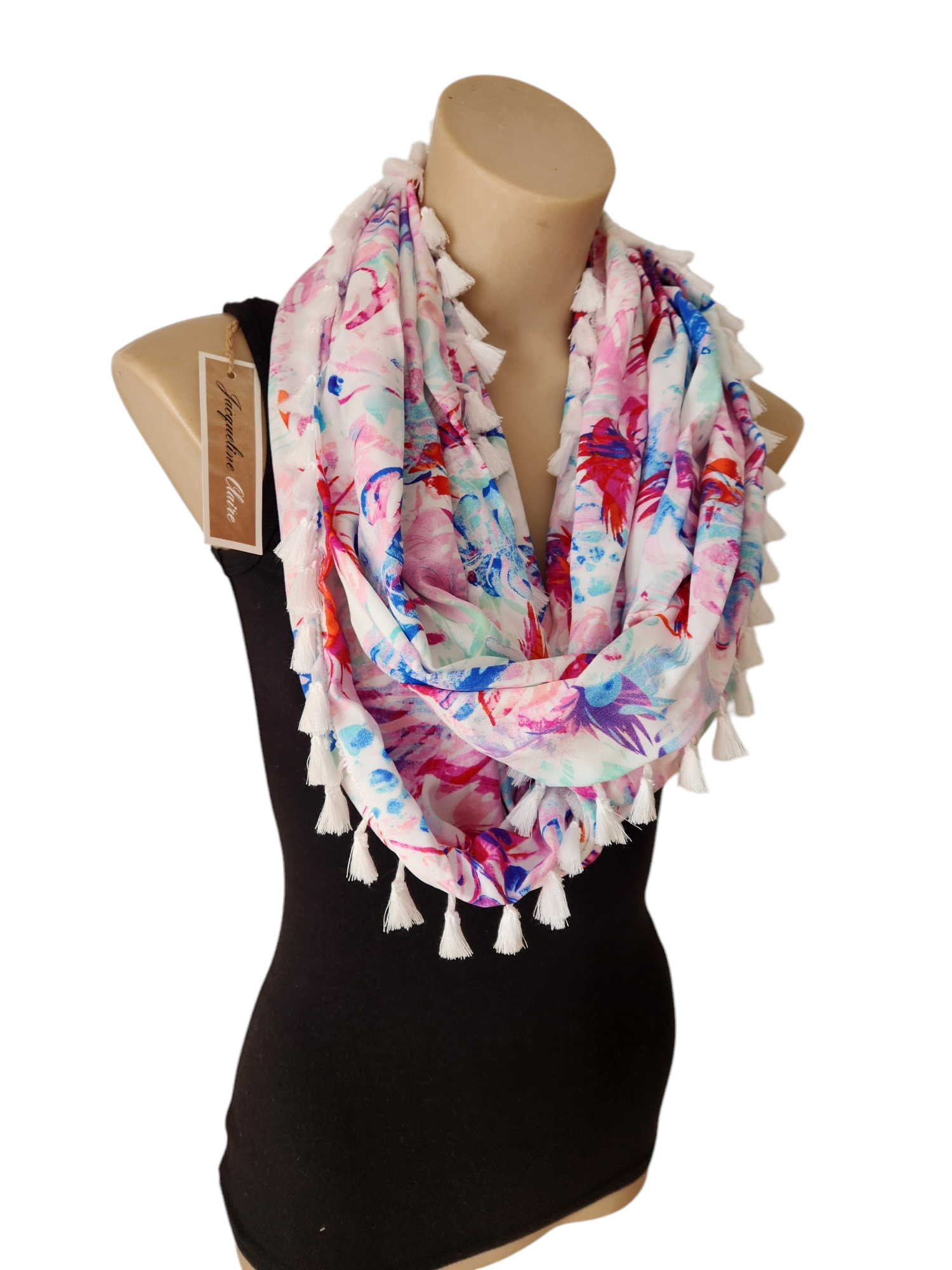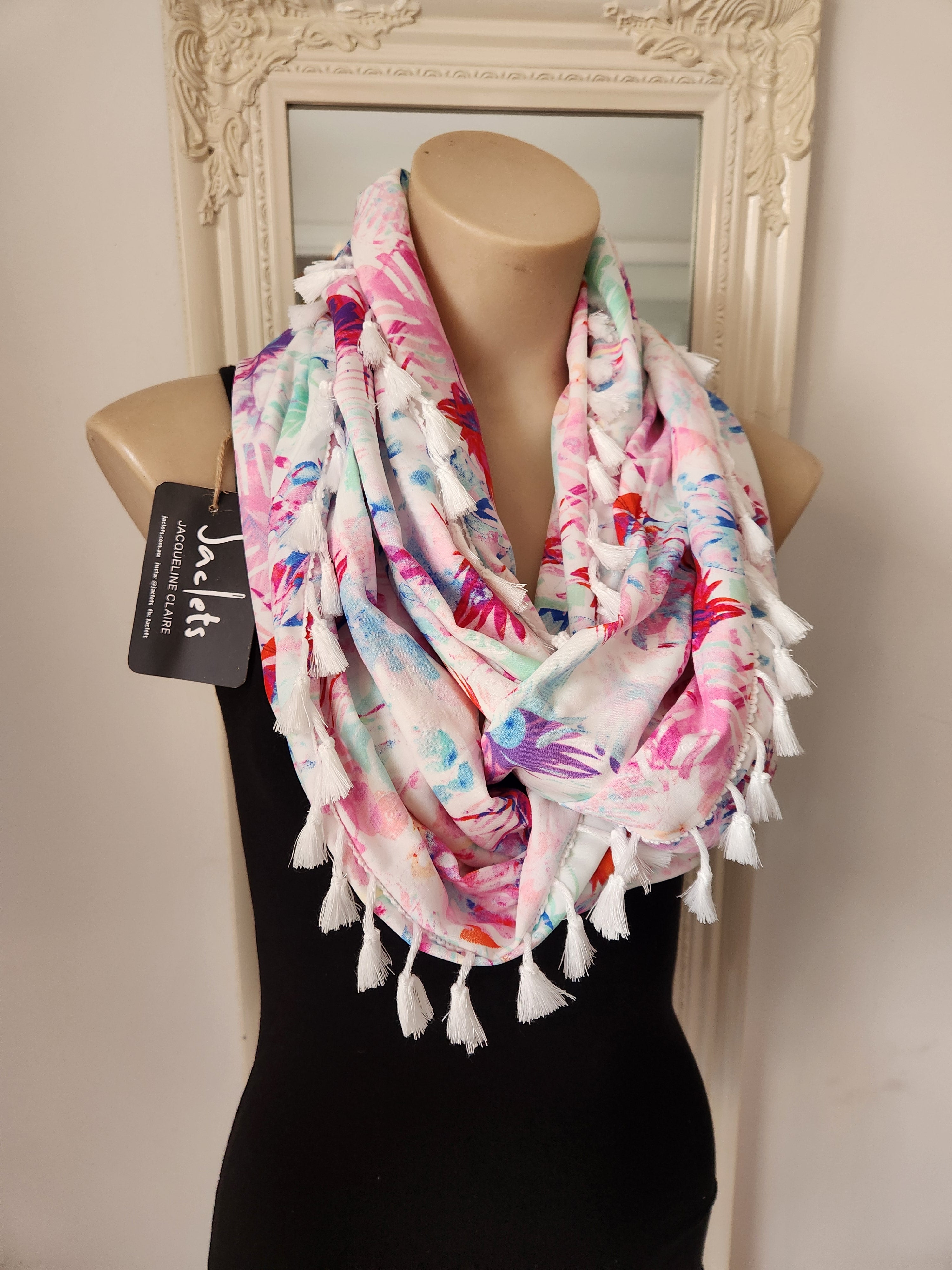 White leaf print with pops of mint, cobalt, pink and orange with fresh white tassels. Light soft rayon fabric so it's lovely and drapey. The single loop is about 100cm long and gets looped twice around your neck or wrap it around 3 times if you'd like it sitting higher up on your chest.