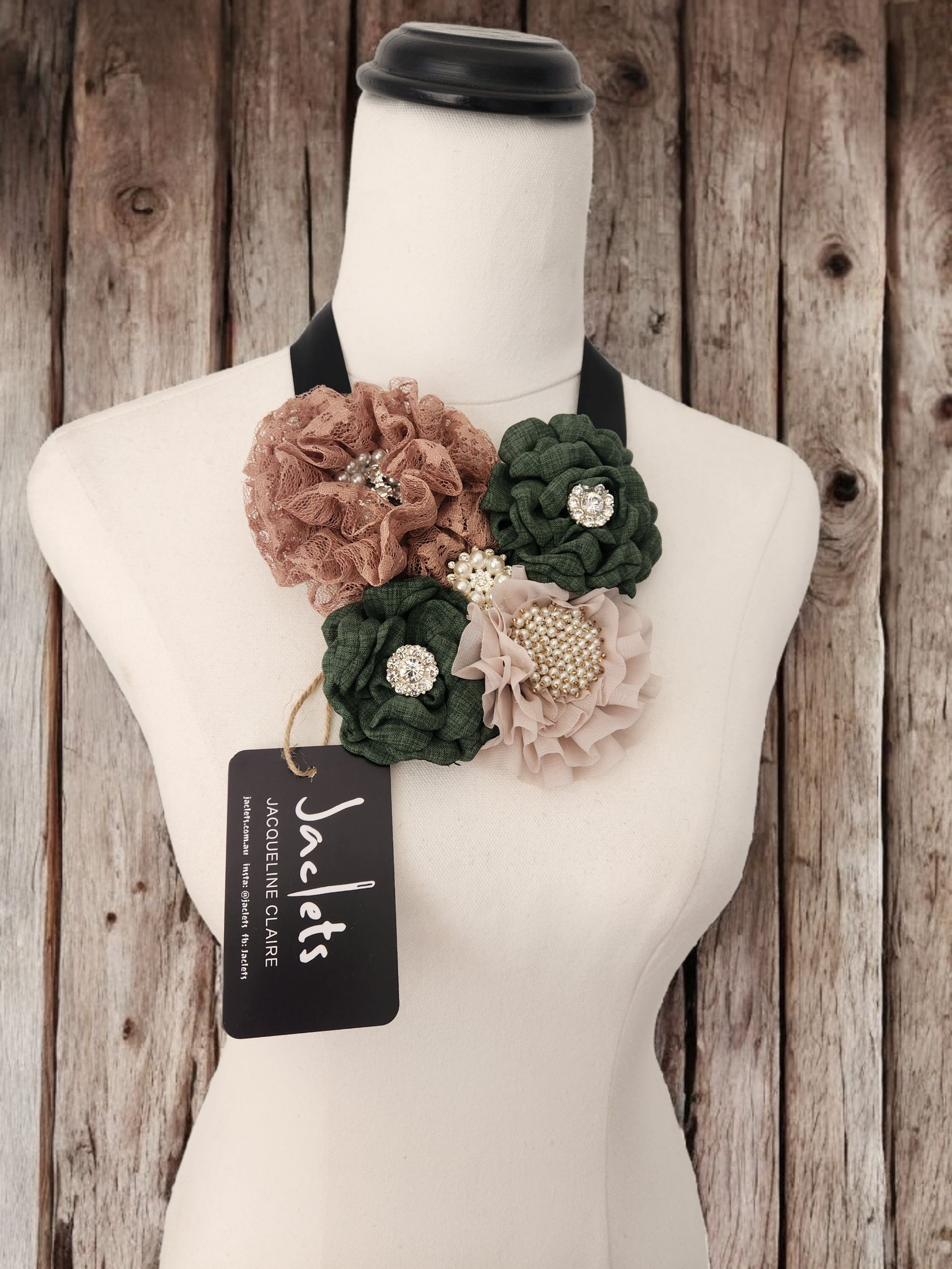 This is a one of a kind necklace, handmade fabric flowers in forrest green and mocha tones. It ties up with black ribbon, so the length is adjustable.