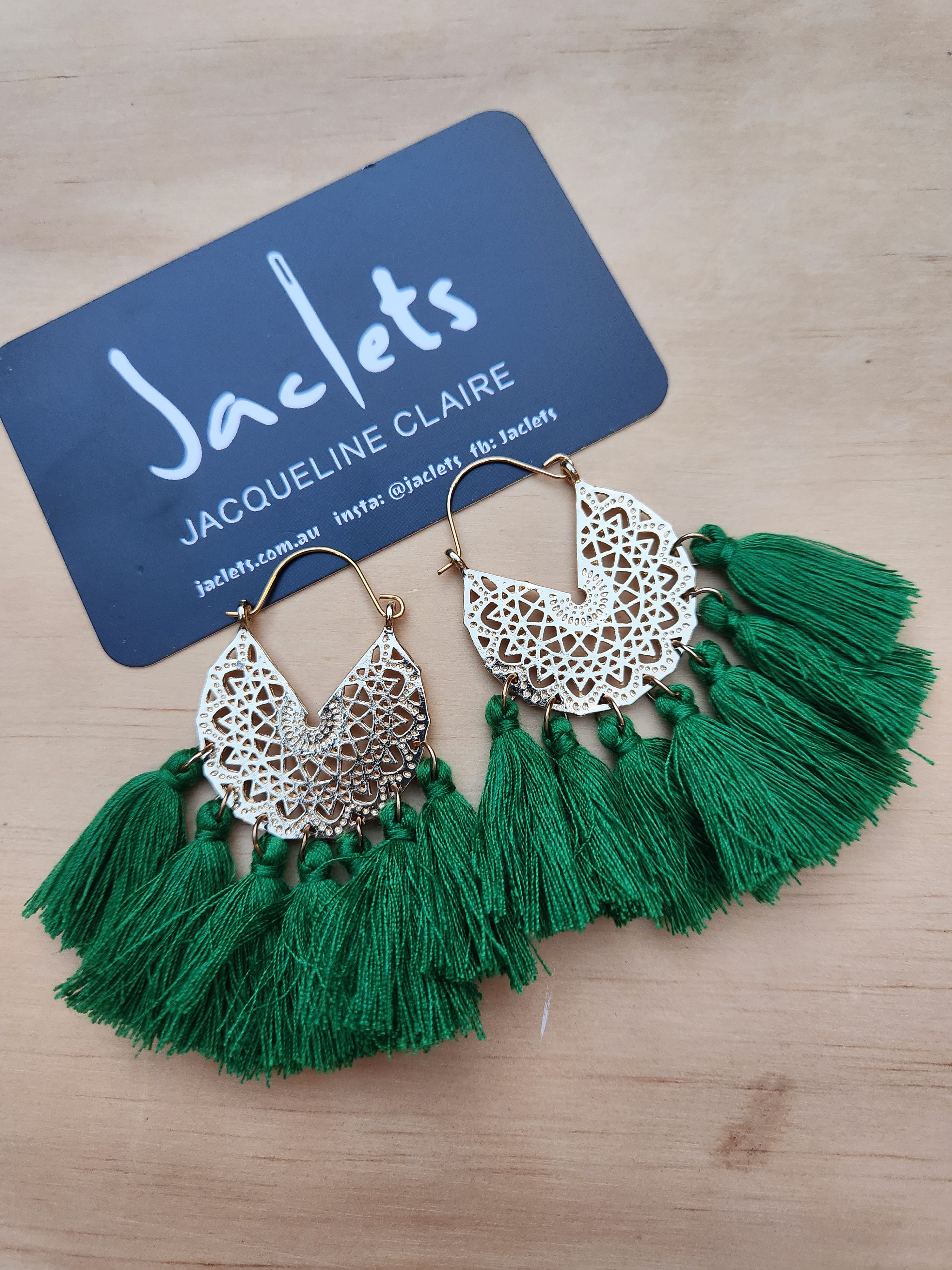 Such a fun pair of tasselled earrings! Gold with bright vibrant green tassels.