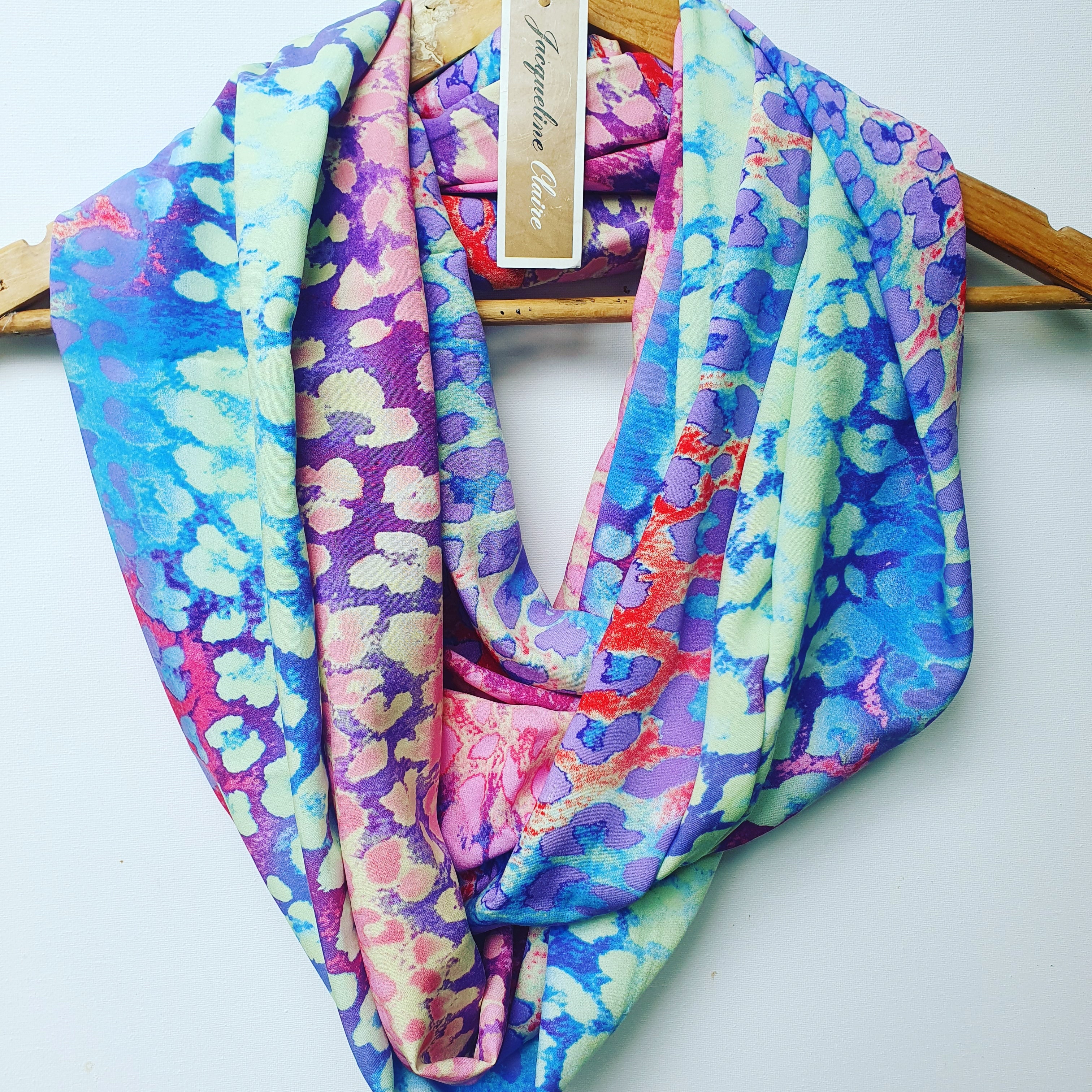 Gorgeous pastel print, plain edging, no tassels. Double loop shape. Looks great with any pastel colour or black or white top.