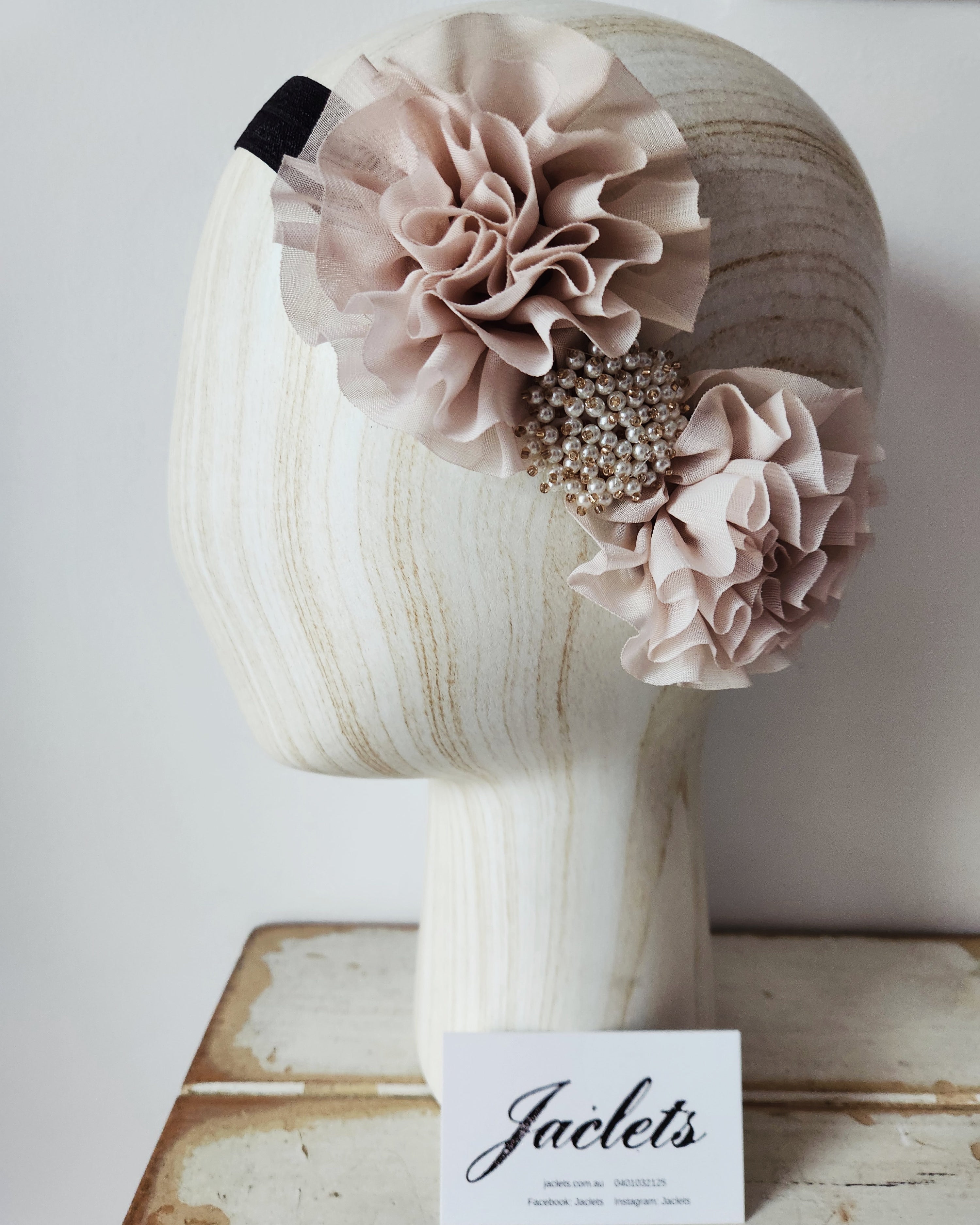 Soft beige ruffle flowers with a beautiful bead piece.
