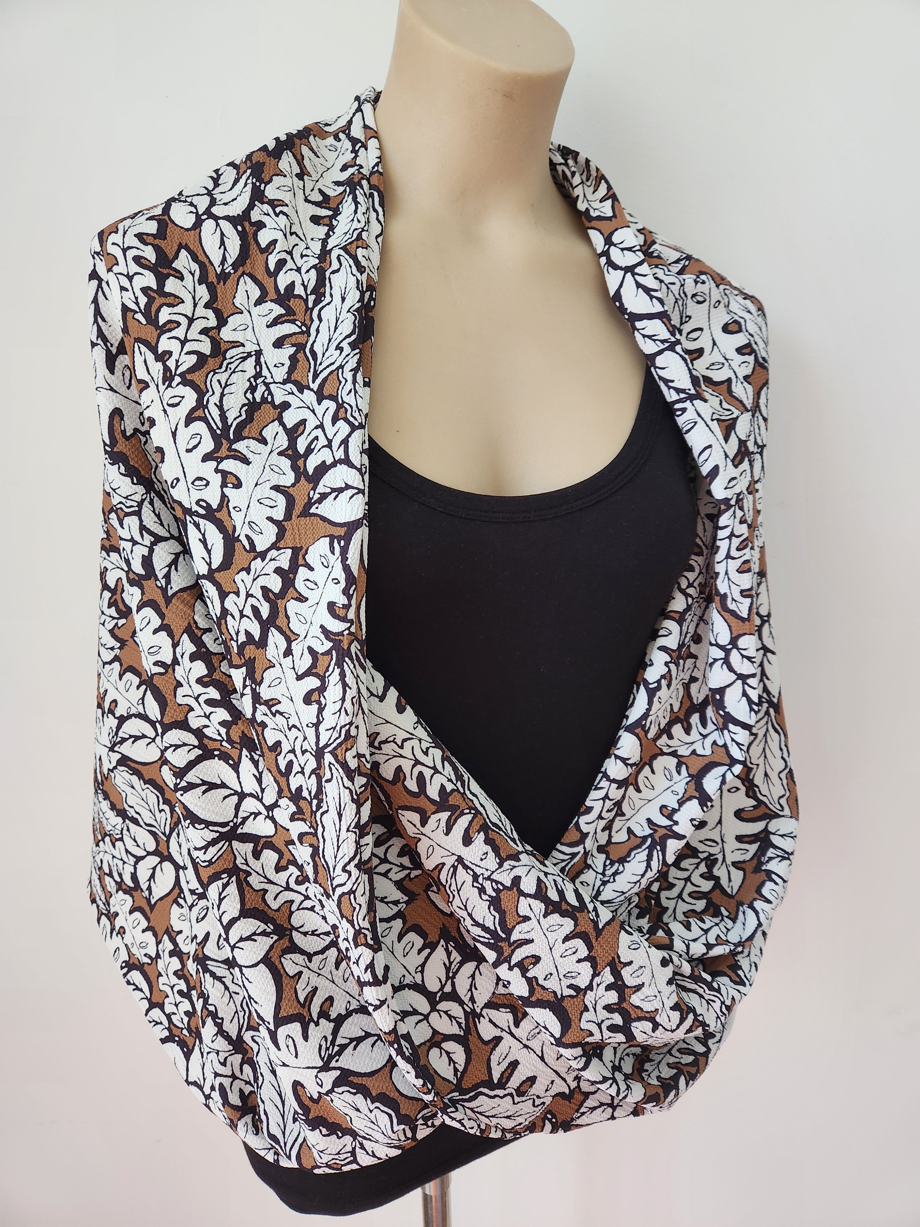 The perfect piece to pop over a plain outfit for some coverage when it's cool, or to keep the sun off your arms and shoulders. This versatile piece will take you from the beach, to a restaurant. In your favourite soft drapey fabrics and gorgeous prints. This fabric is a soft drapey crepe. The colours are mocha, black and white.