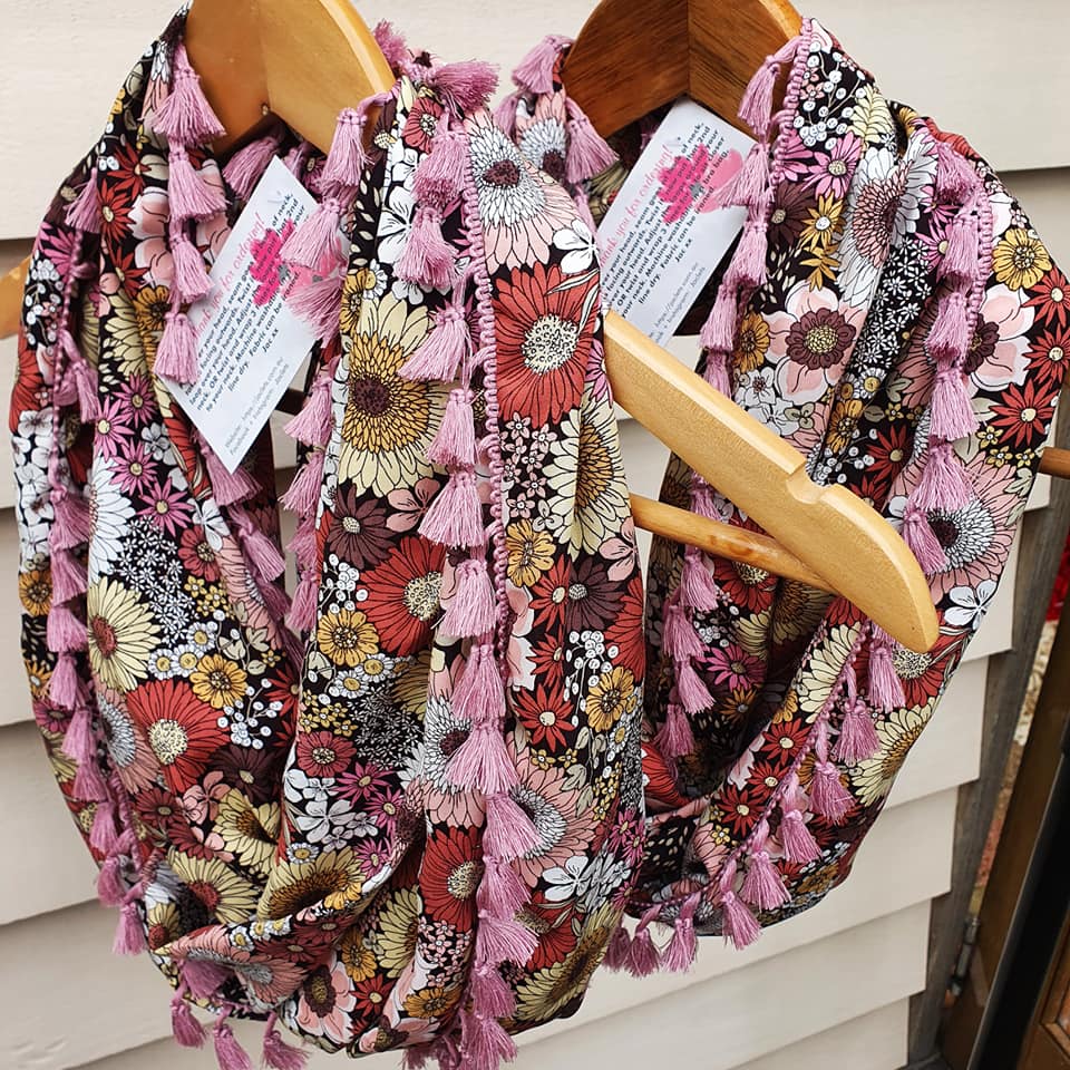 An intricate little print with lots of gorgeous colours, this one is perfect over so many different plain coloured tops. Its light soft rayon fabric so its lovely and drapey for the loop shape. The single loop is about 100cm long and it gets looped twice around your neck so it looks as pictured when worn. Machine washable in a bra bag and fabric can be ironed, line dry. Handmade in Brisbane.