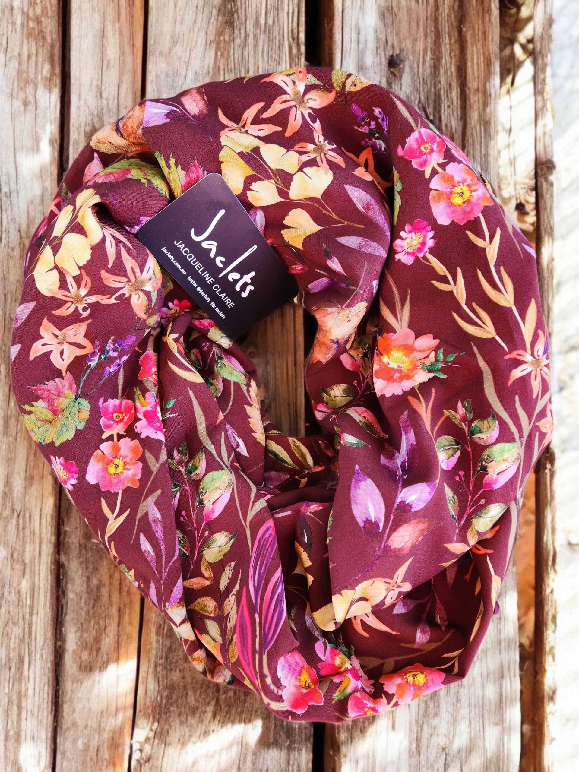 A lovely piece to wrap loop around your neck when it's cool. The single loop is about 95cm and gets looped twice around your neck so it looks as pictured when worn. It's light soft rayon fabric so its lovely and drapey for the loop shape. Machine washable in a bra bag and fabric can be ironed and line dry.