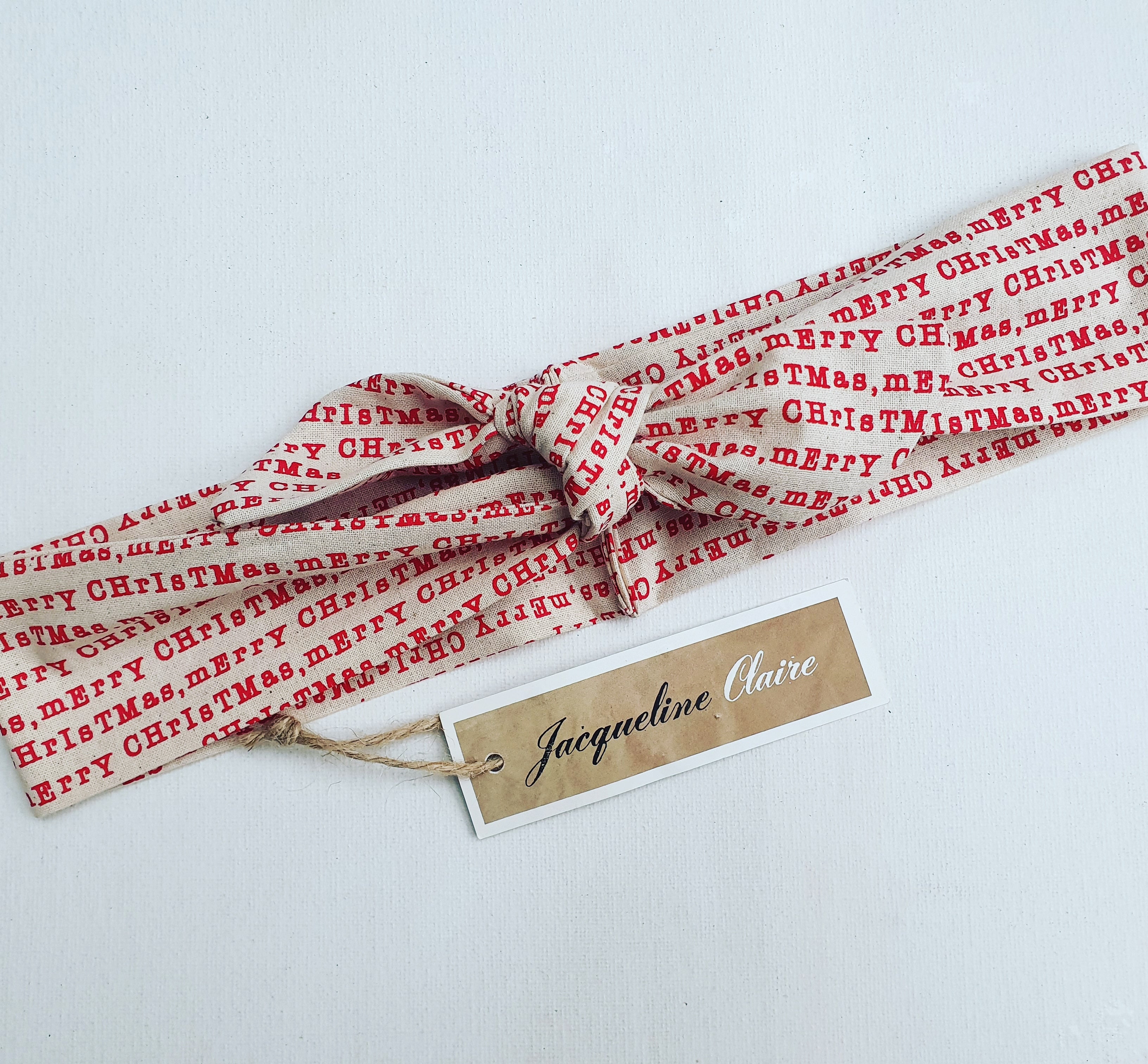 Oatmeal with red Merry Christmas lettering. Ties up to fit your head. A fun accessory for the festive season!