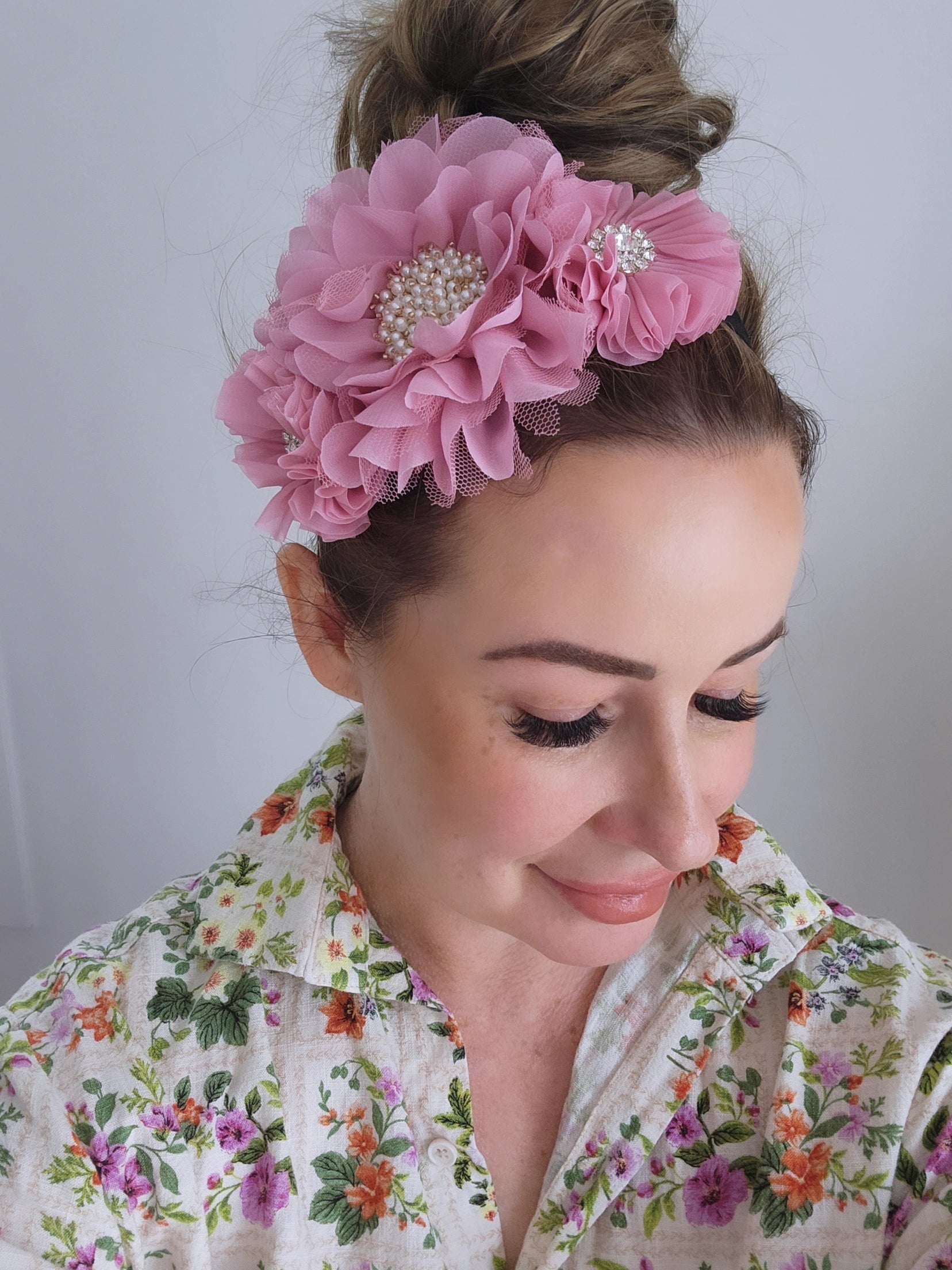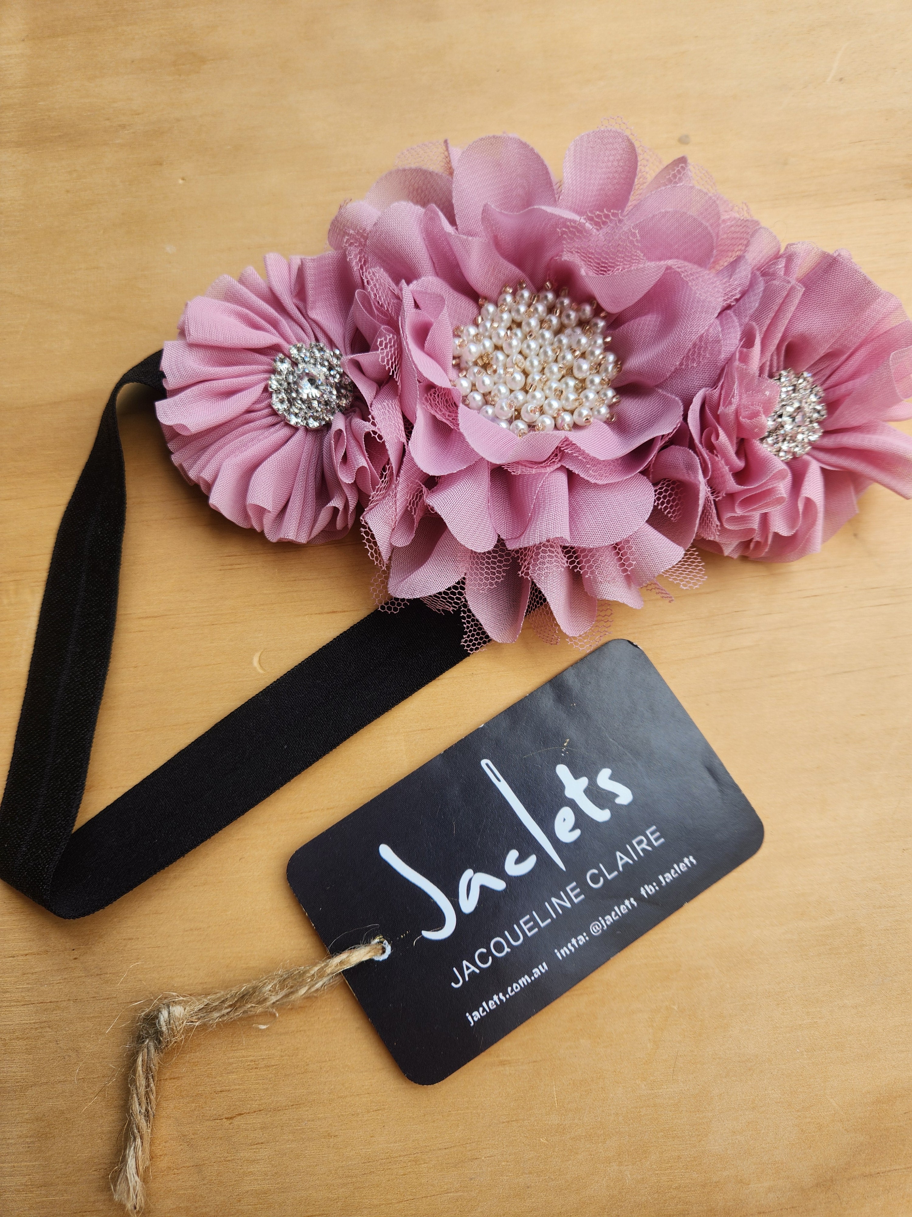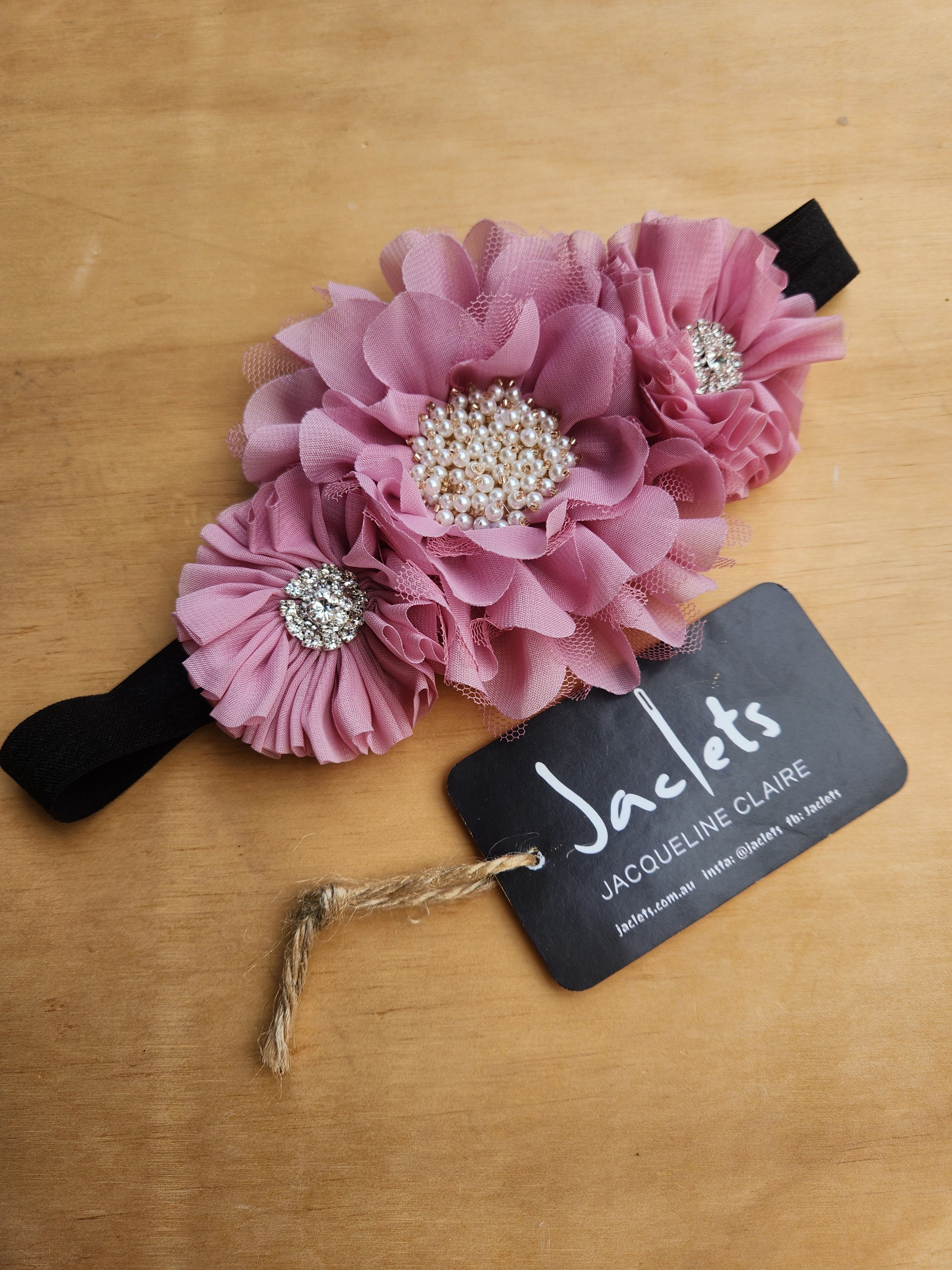 3 pretty pink flowers adorne this gorgeous headband.