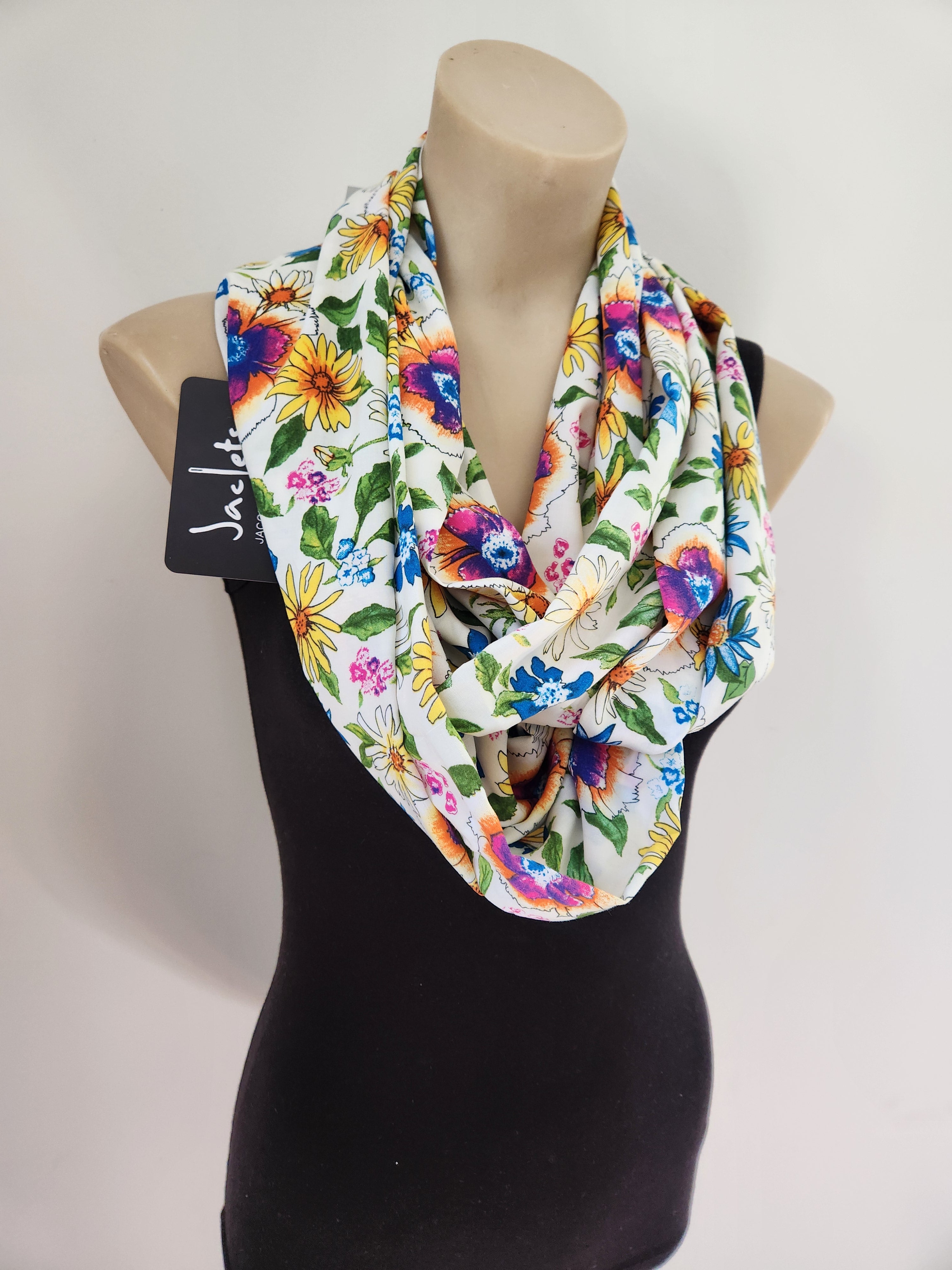 Soft vanilla with pretty coloured flower print in vibrant pinks, blues and greens. This one is a fun little print. Its light soft rayon fabric so its lovely and drapey for the loop shape. The single loop is about 95cm long and gets looped twice around your neck so it looks as pictured when worn. Machine washable in a bra bag and fabric can be ironed, and line dry.