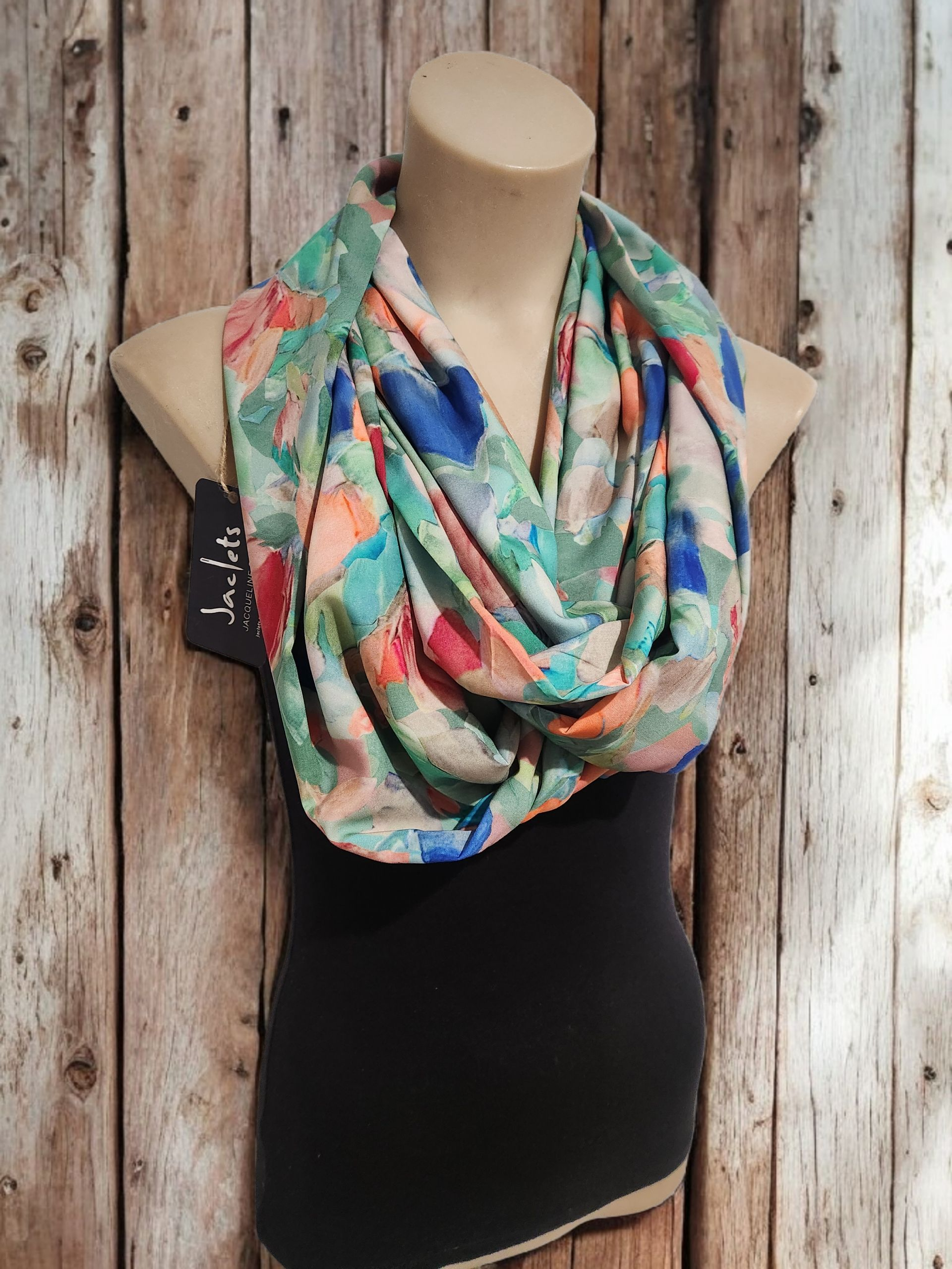 Artistic watercoloured flowers with splashes of muted pinks, blues and greens make up this print. It's made from lovely quality light soft rayon fabric so its lovely and drapey for the loop shape. The single loop is about 95cm long and gets looped twice around your neck so it looks as pictured when worn.