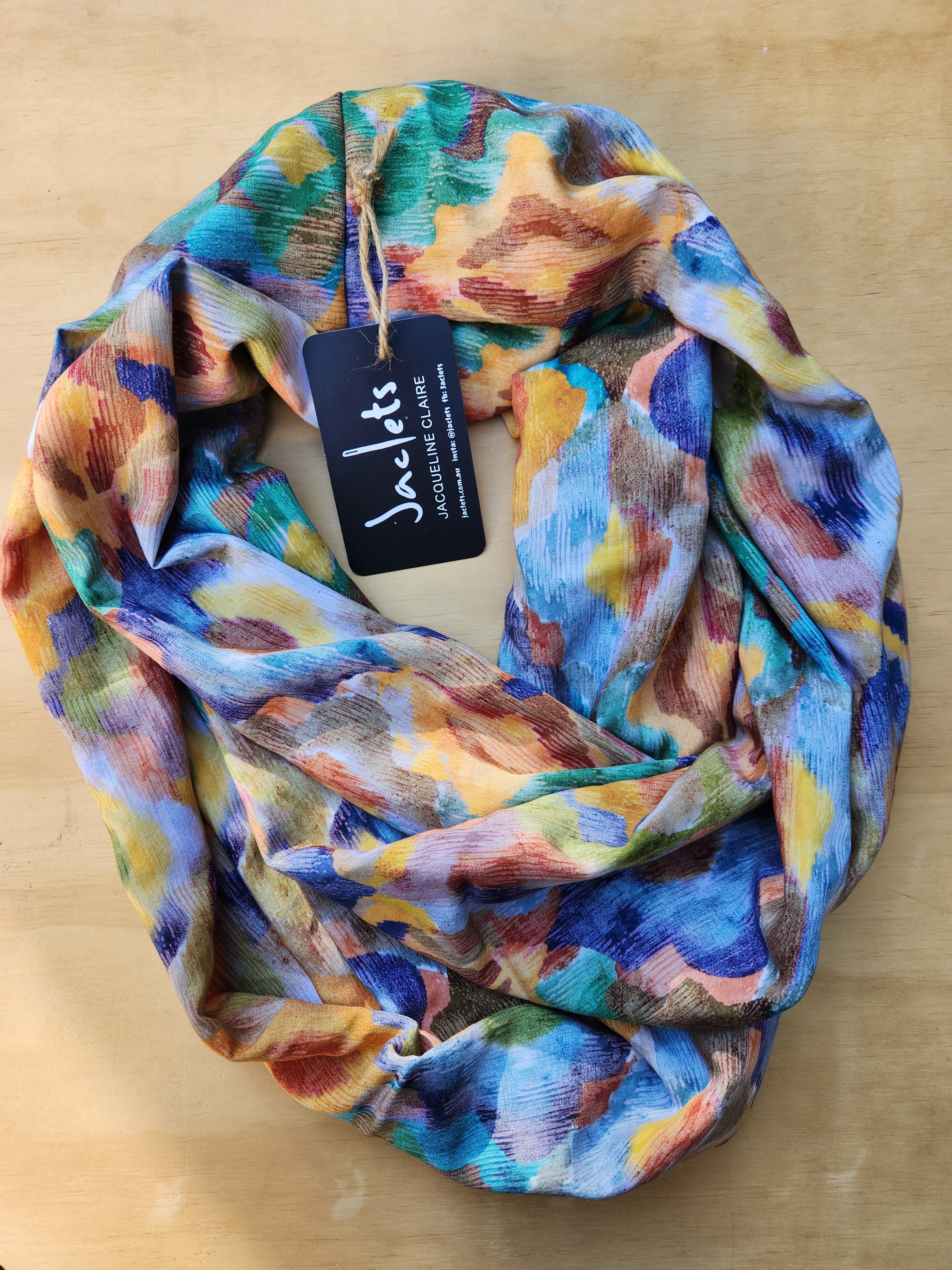 A unique pattern reminiscent of Morrocan tiles and the exotic vibe of Marrakech. The fabric is quality rayon, so its lovely and drapey for the loop shape. The single loop is about 95cm long and gets looped twice around your neck so it looks as pictured when worn.