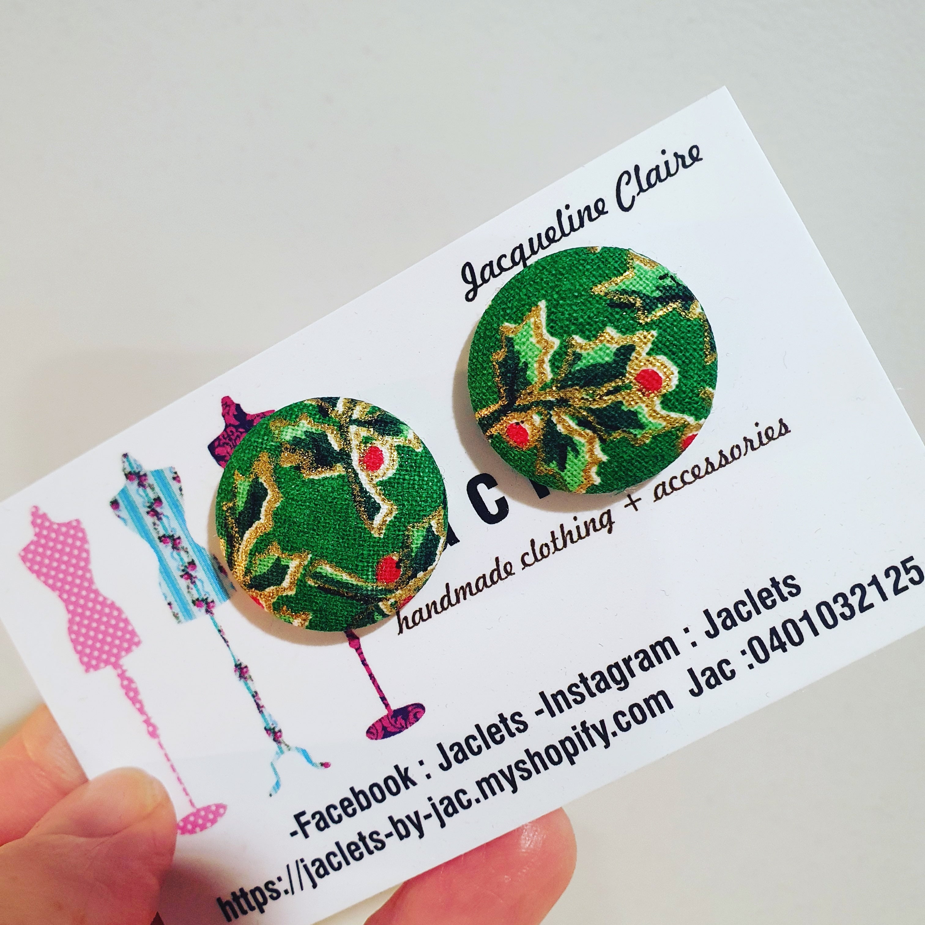 Pretty little holly print fabric studs in christmas-green. 23mm sized. Surgical steel post and backing.