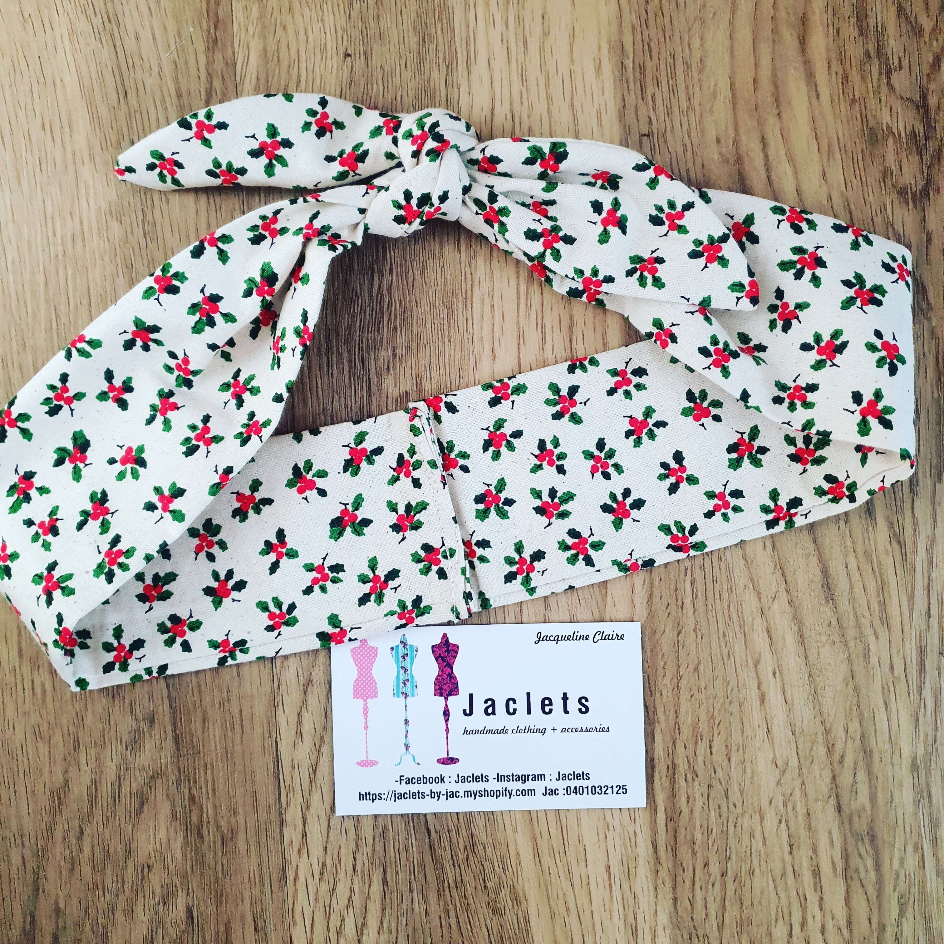 Cute little holly print fabric, ties up to fit your head. A perfect accessory for the festive season.