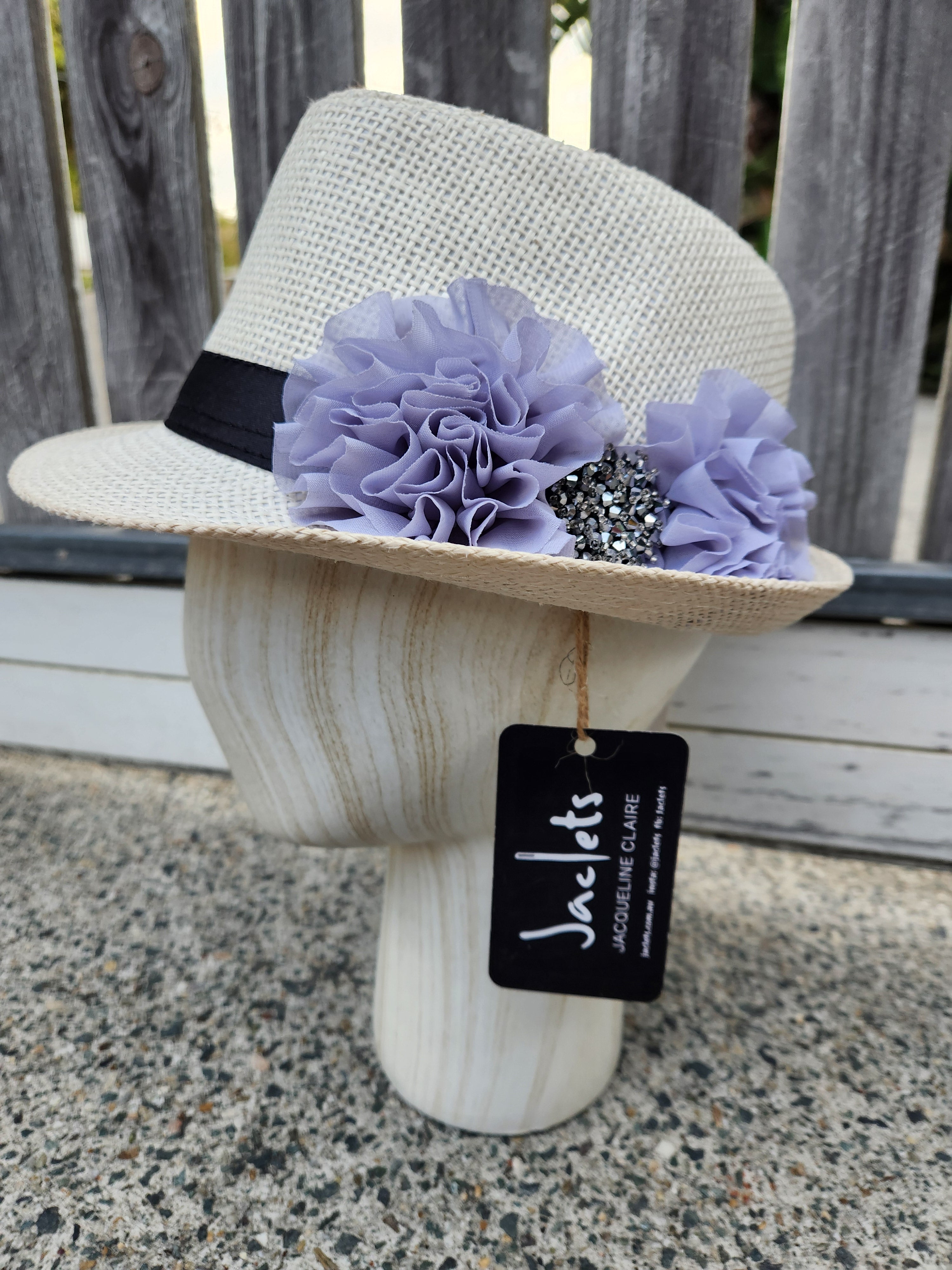 Oatmeal hat with gorgeous ruffley grey flowers and a beaded piece.