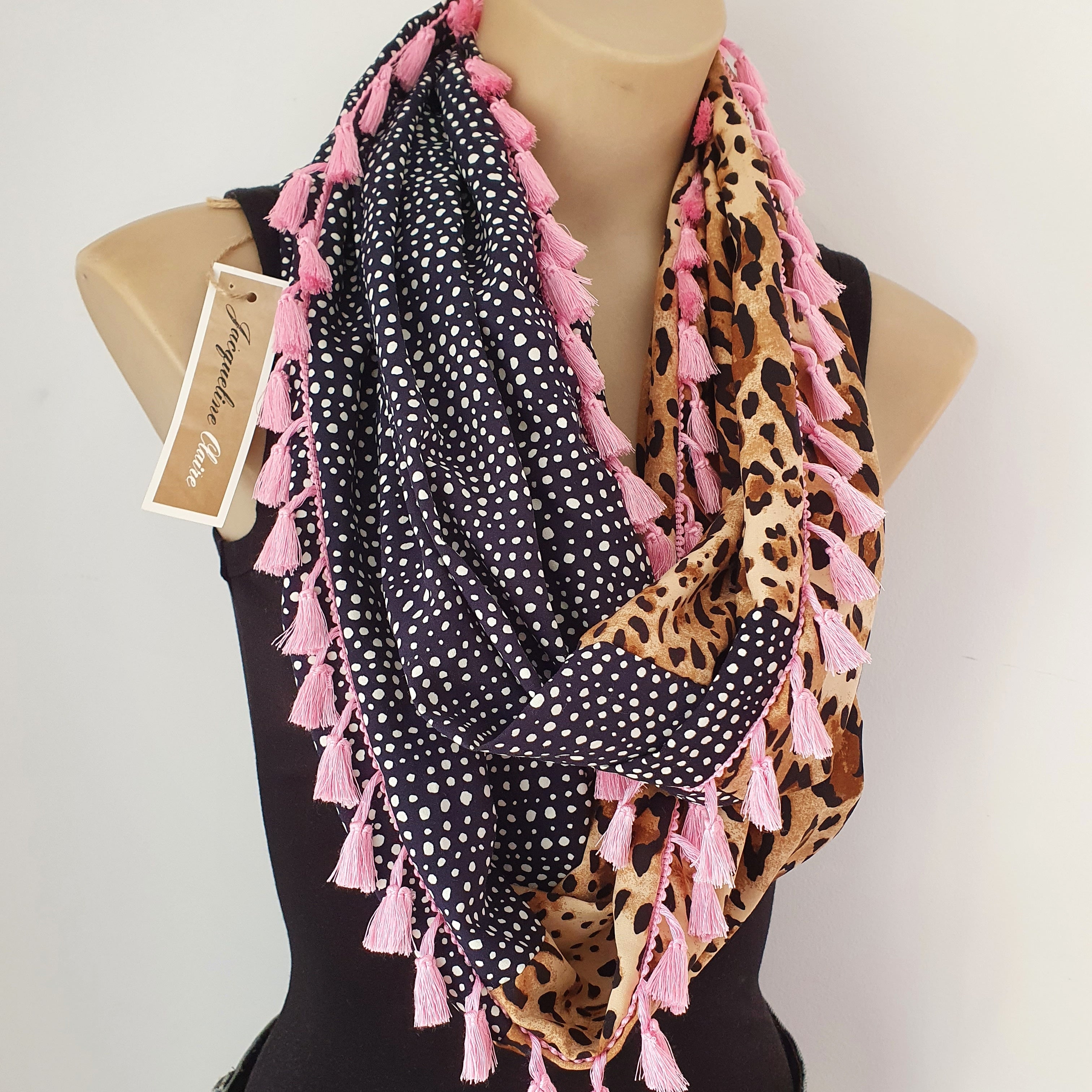 Made of 2 prints, leopard + black and white, with lolly pink tassels. A gorgeous piece to add to a plain outfit.
