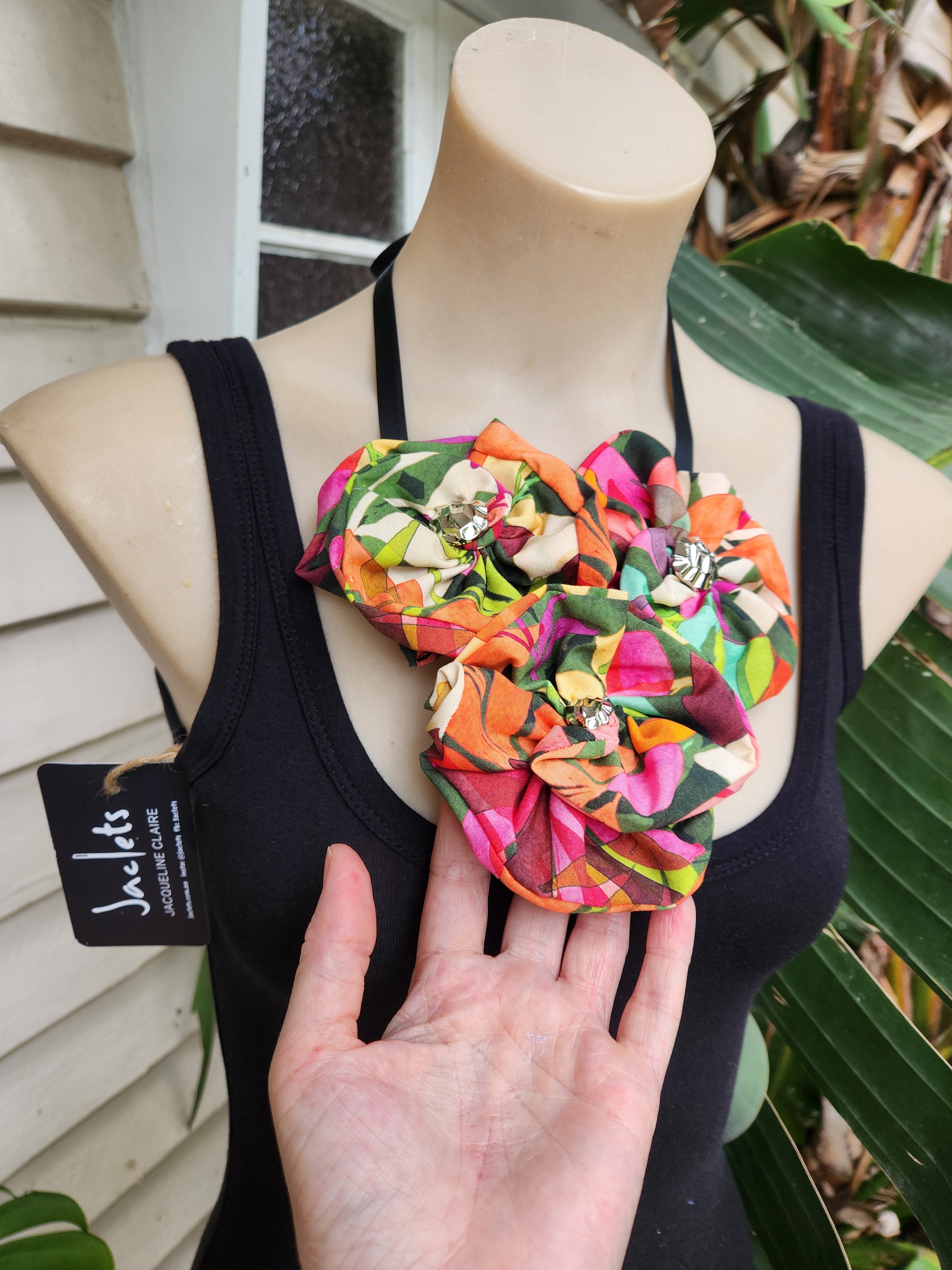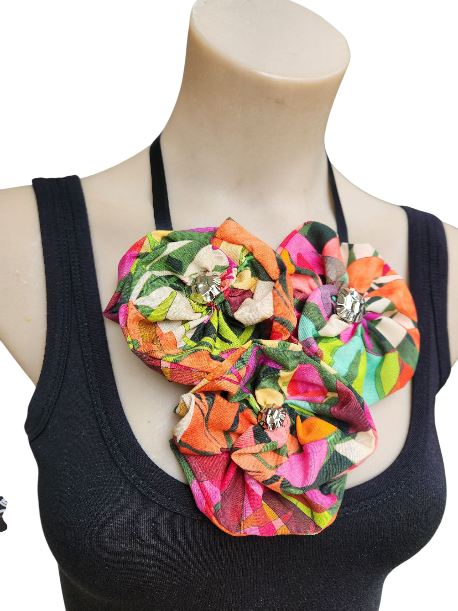 Features 3 handcrafted fabric flowers with crystal embellishments.
