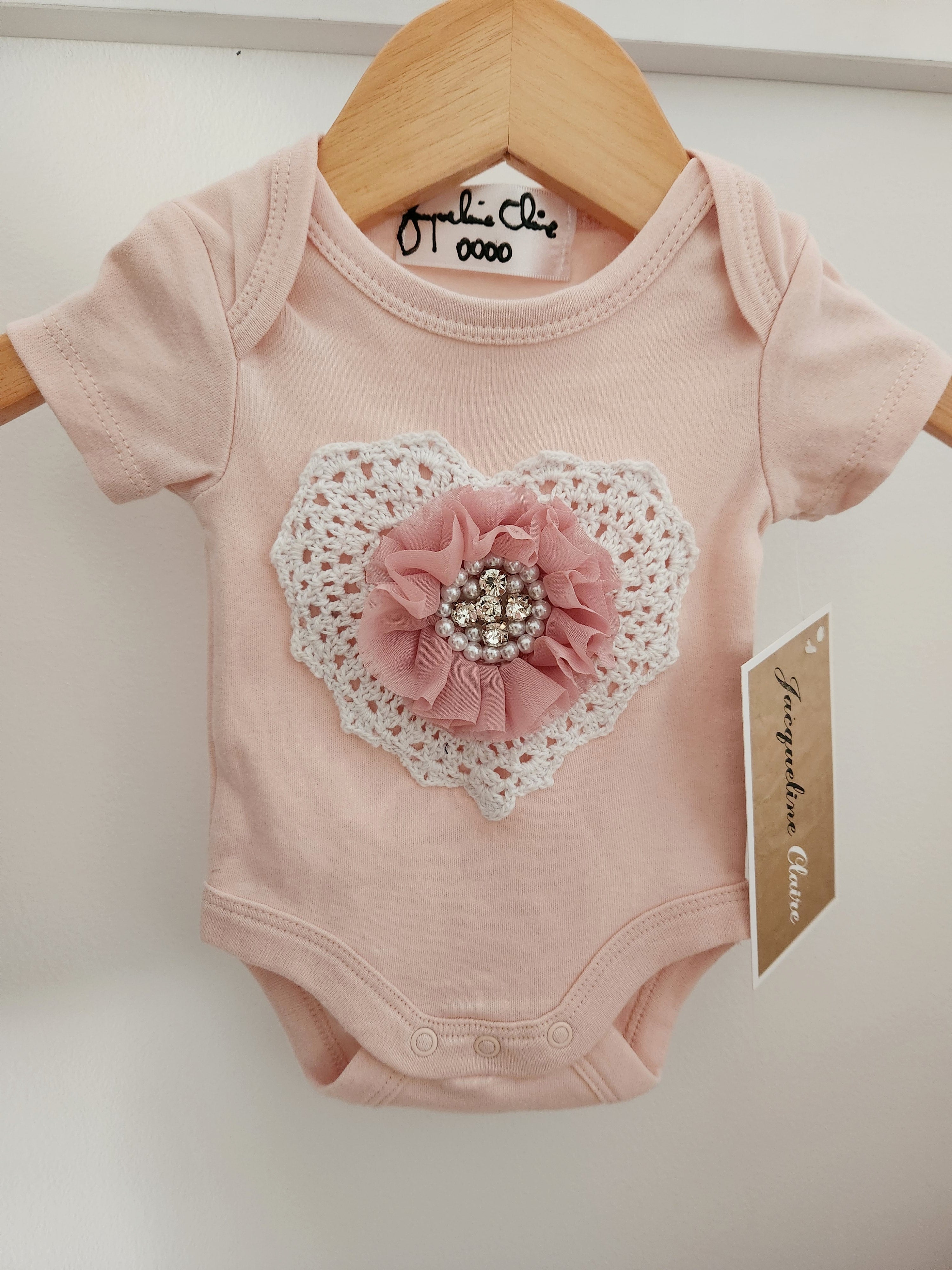 Soft pink cotton baby suit with white crochet heart and pink flower. Machine washable in a bra bag and line dry.