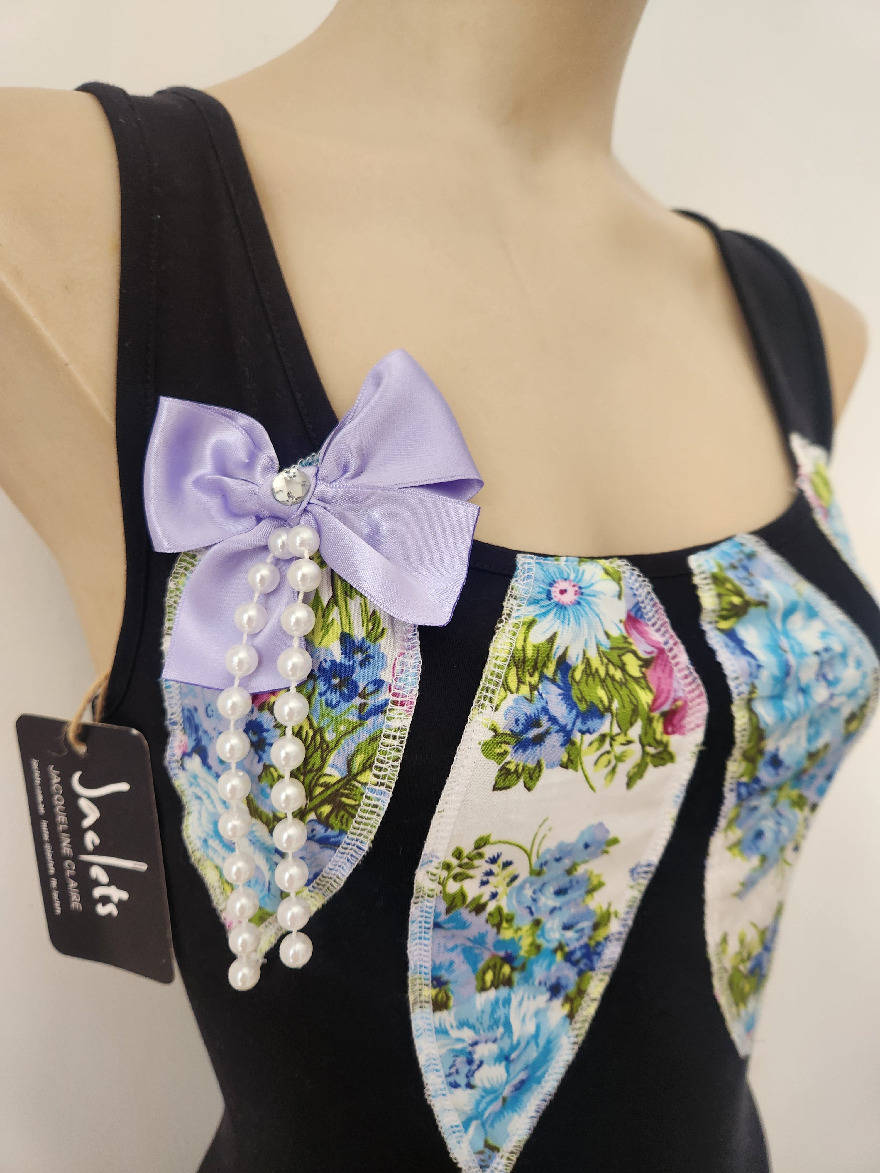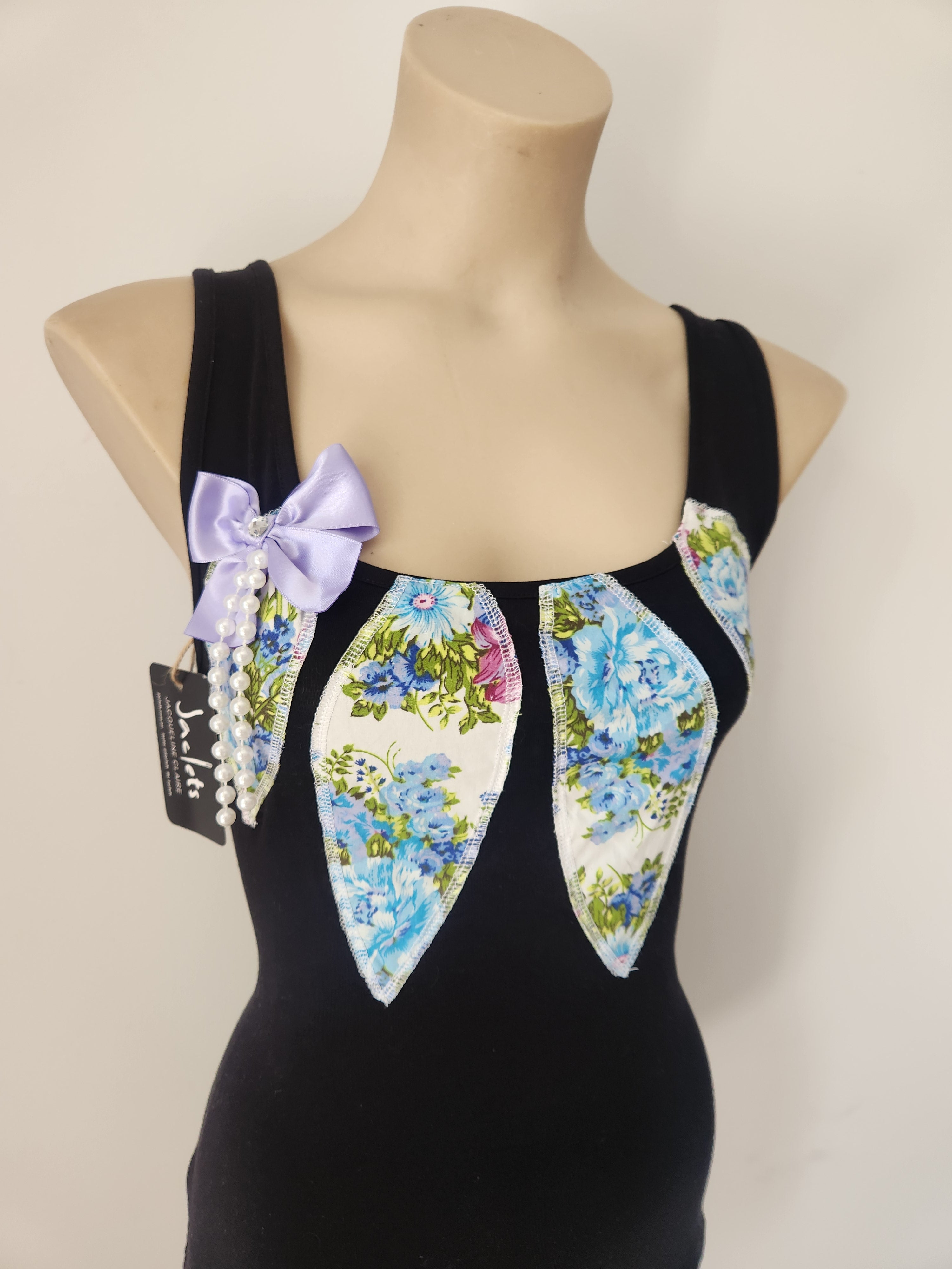 This striking handmade top brings a touch of whimsy and romance to everyday wear. The top is flat and stretchy cotton elastanefabric, and it features vintage-inspired floral fabric panels in shades of blue, green, and white — carefully sewn to create a flattering central design.