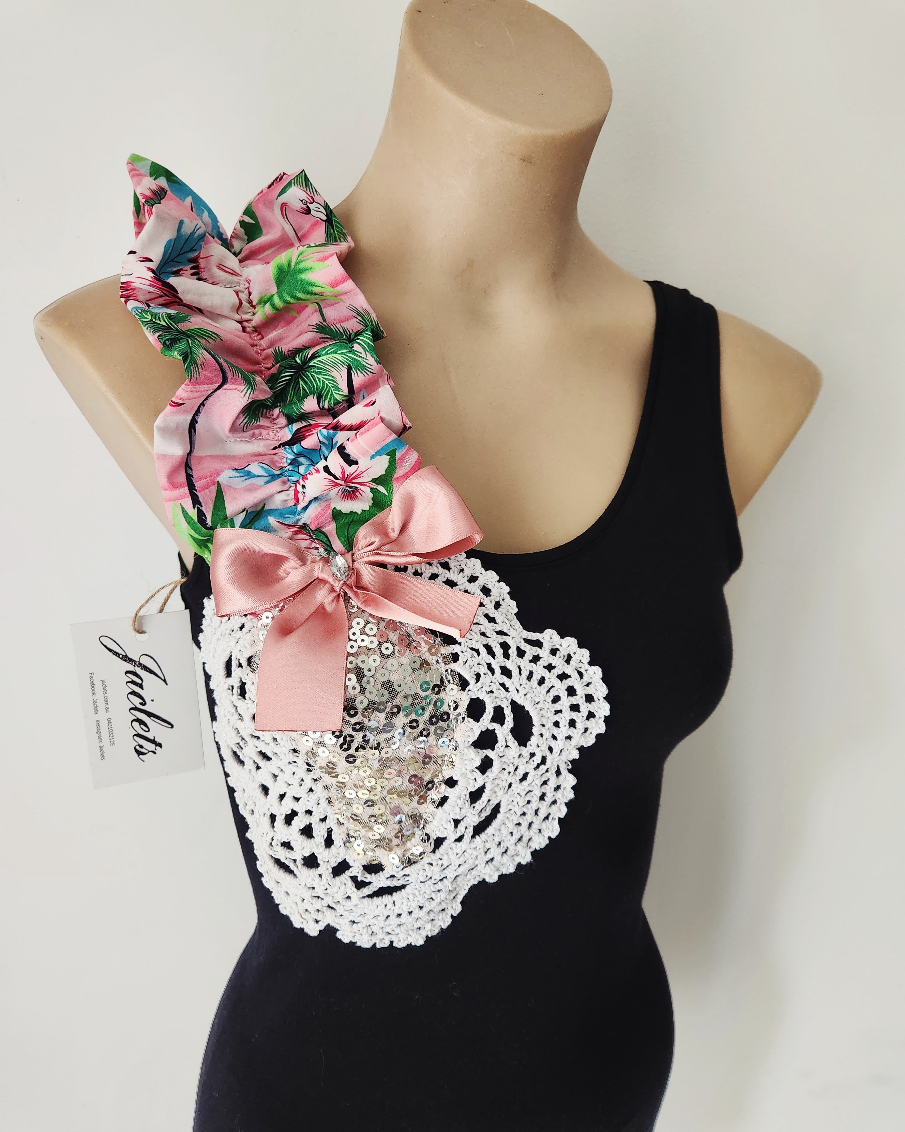 This is a one of a kind piece. The shoulder ruffle is flamingo and palm print, and the design is crochet, sequins, with a handsewn pink satin bow to finish it off.