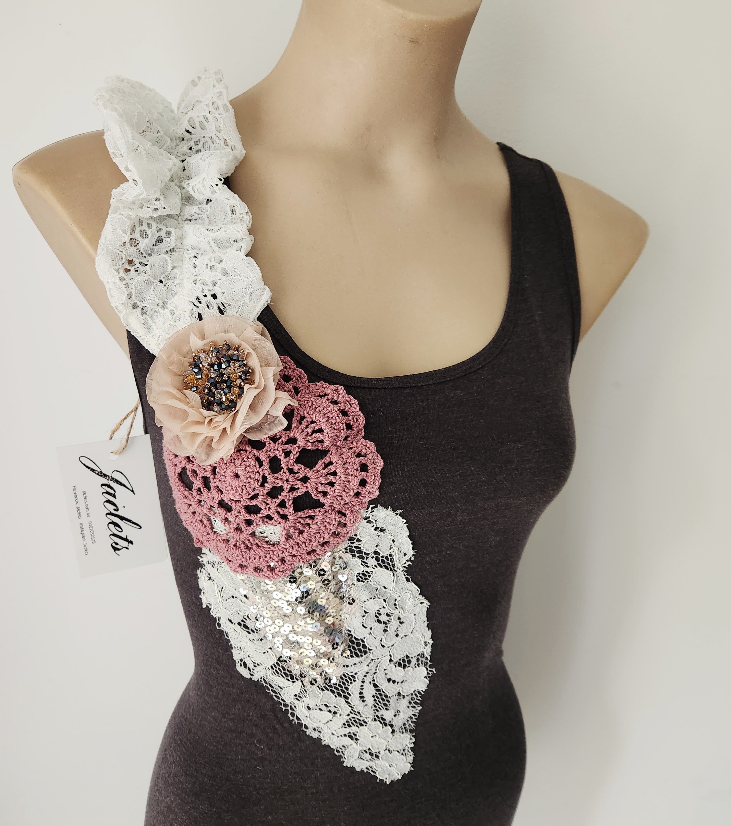This is a one of a kind piece. The shoulder ruffle is soft lace and the design is crochet, sequins, and a gorgeous ruffle flower to finish it off.