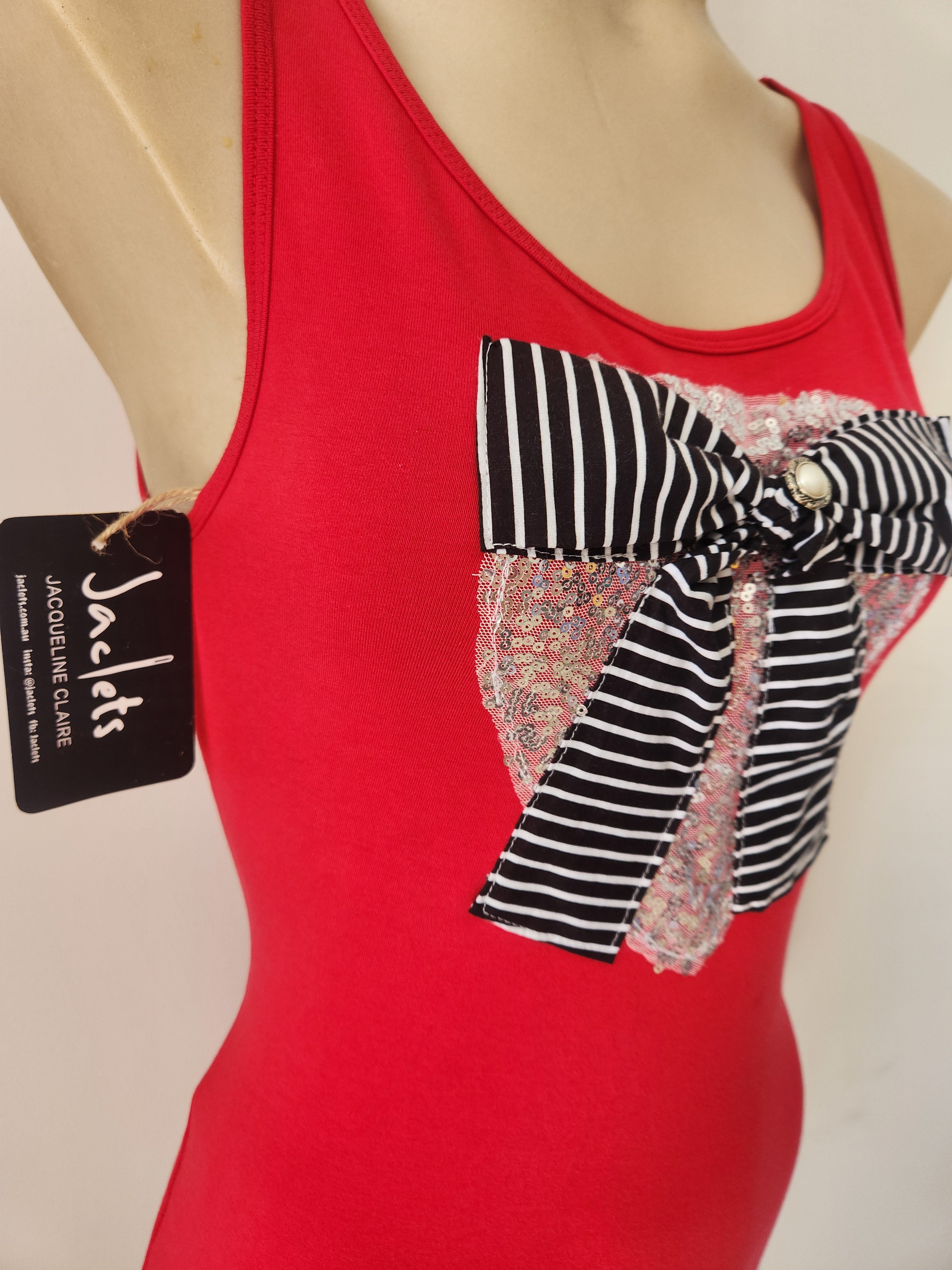 Turn heads in this vibrant red statement top — where playful meets chic. Handmade with love, it features a sparkling silver sequin heart framed by a bold black-and-white striped bow, finished with a pearl-inspired centre detail.