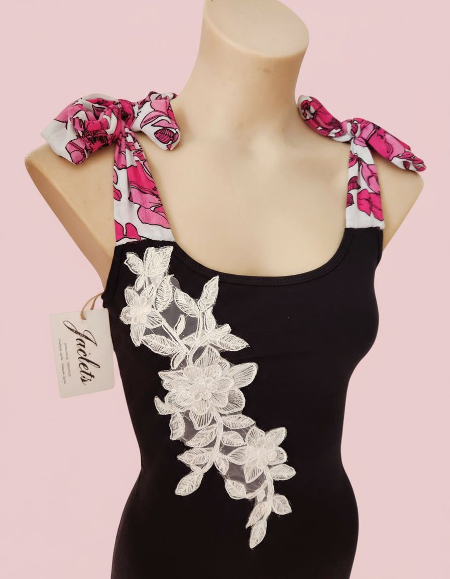 The top is flat and stretchy cotton elastane fabric and sizing is normal, not large or small. To wash, turn it inside out and pop it in a bra bag to best look after the white lace piece. Cold/delicate machine wash and line dry. Handmade in Brisbane.