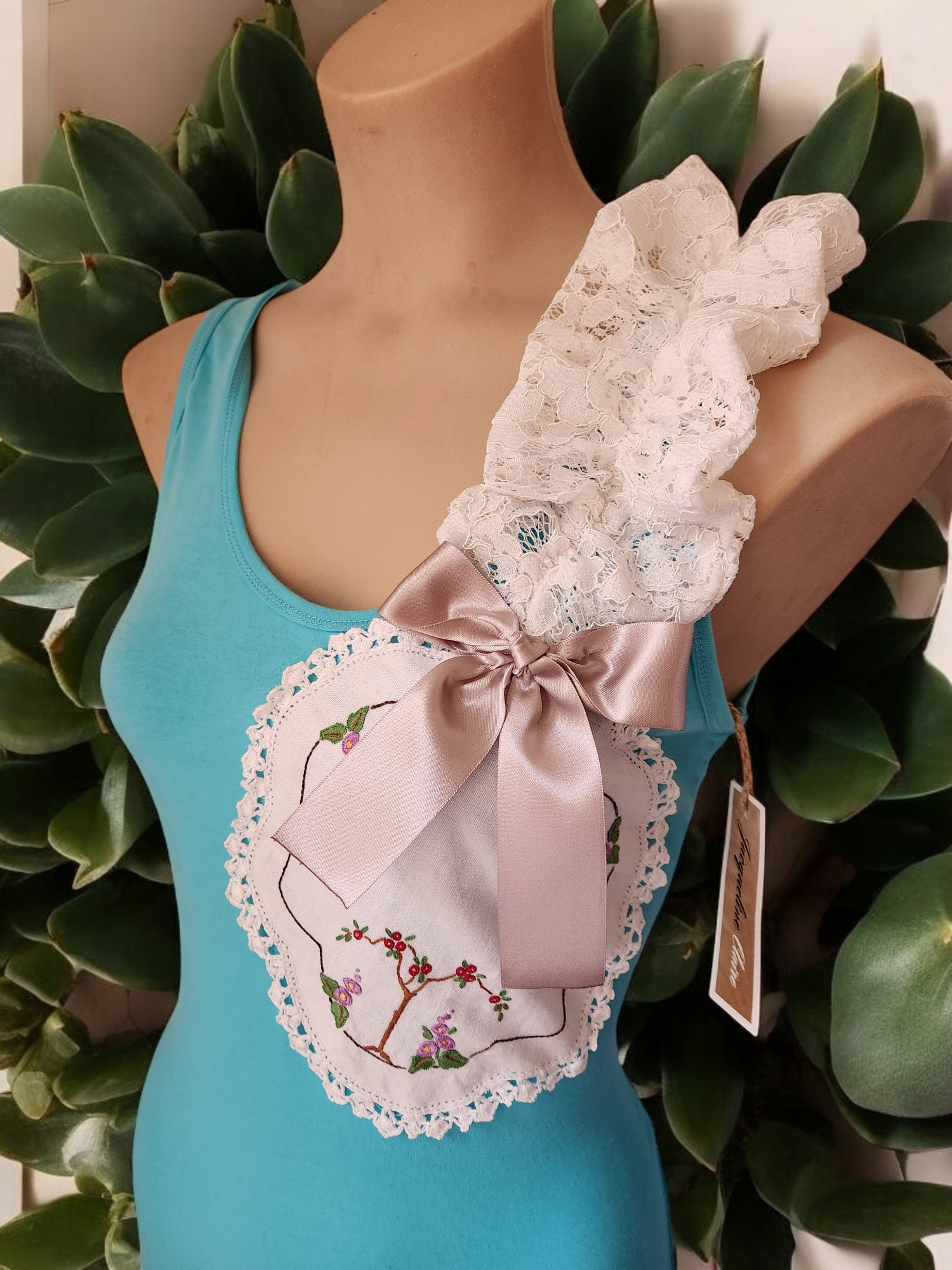 This is a one-of-a-kind top, in Aqua blue with soft lace ruffle shoulder and vintage doily and satin bow detail. The design placement is flattering and the bow sits up on your chest.