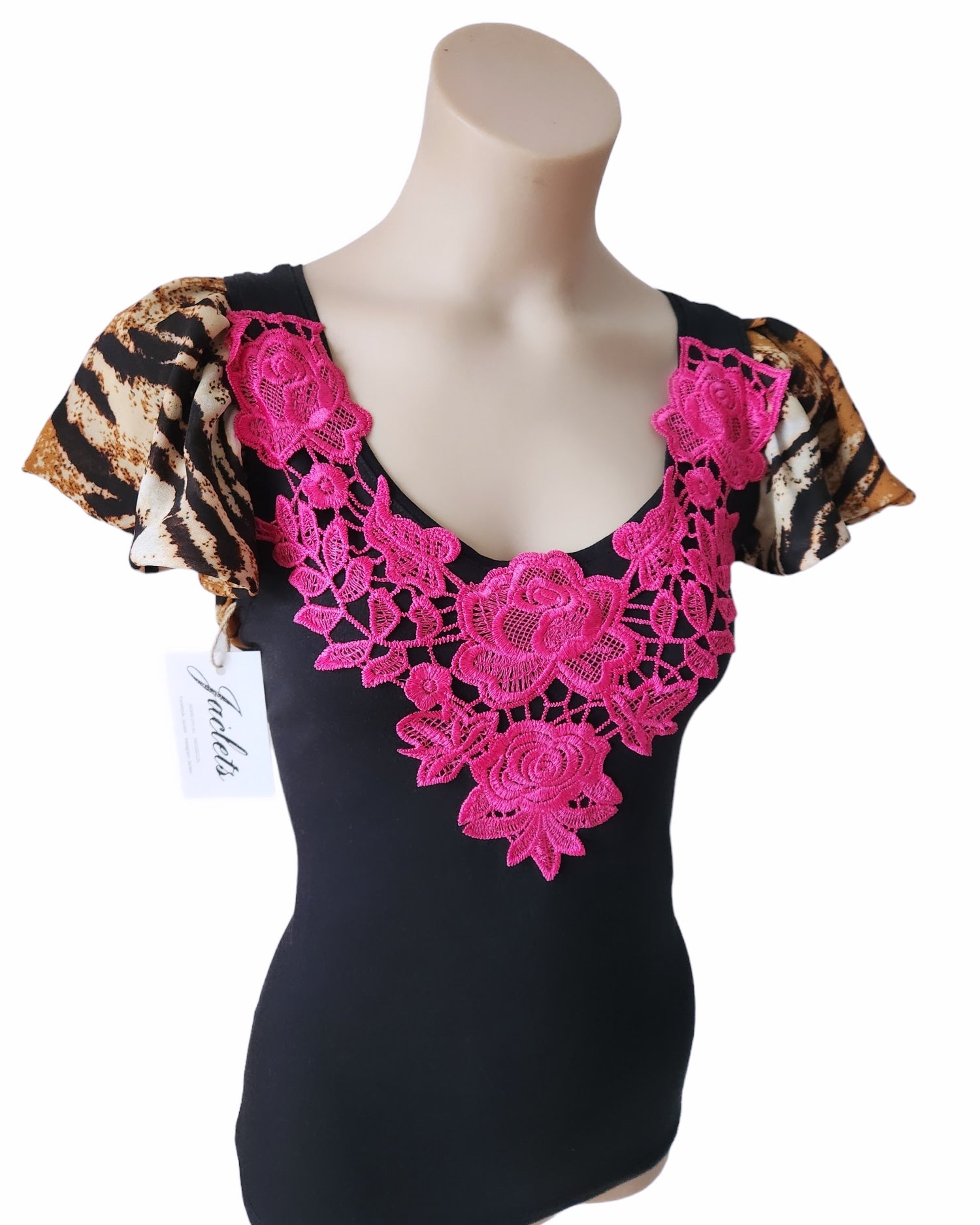 This top is stunning! Vibrant pink neckline, and little leopard print floaty shoulder ruffles. Only 1 available.