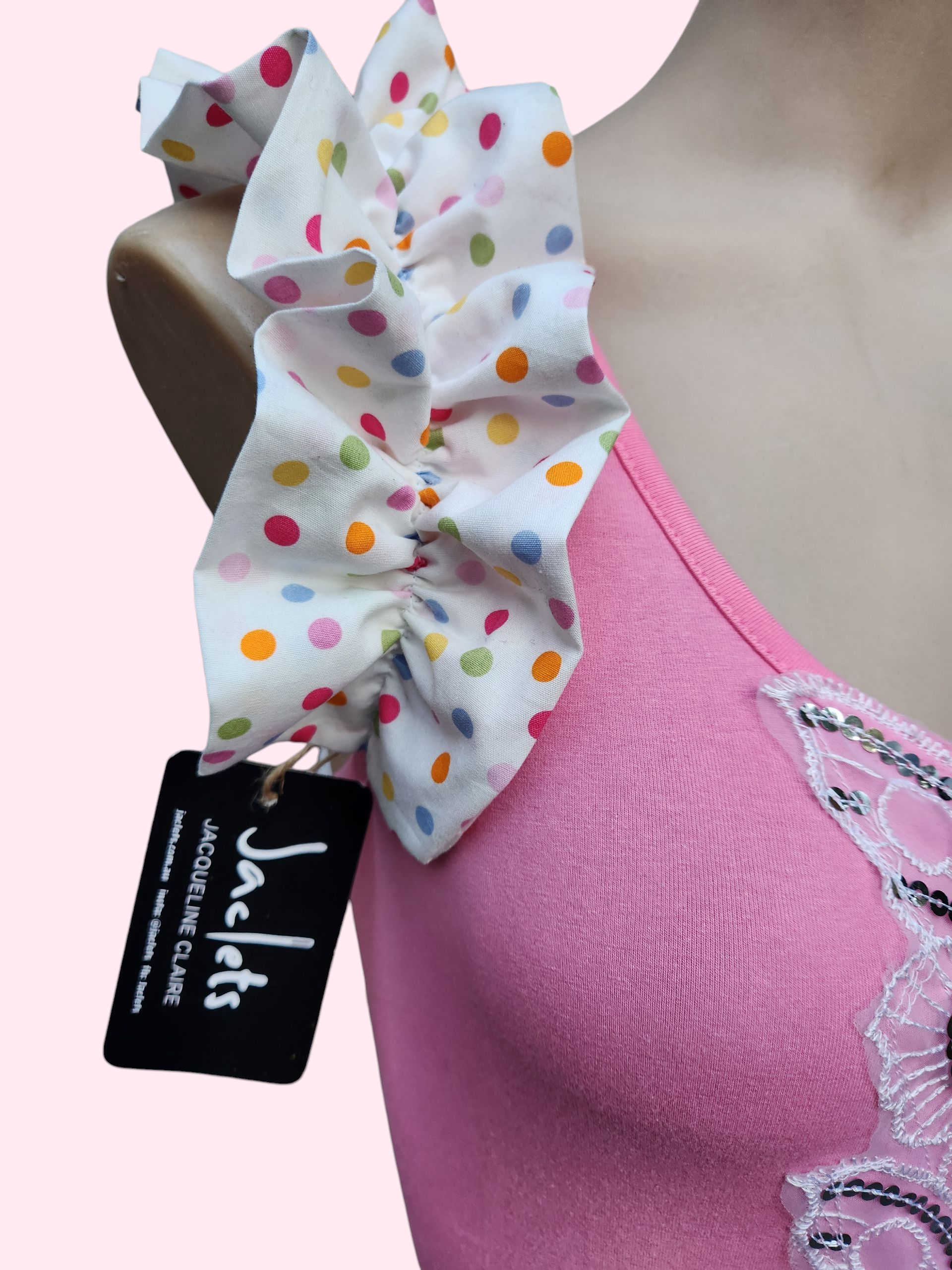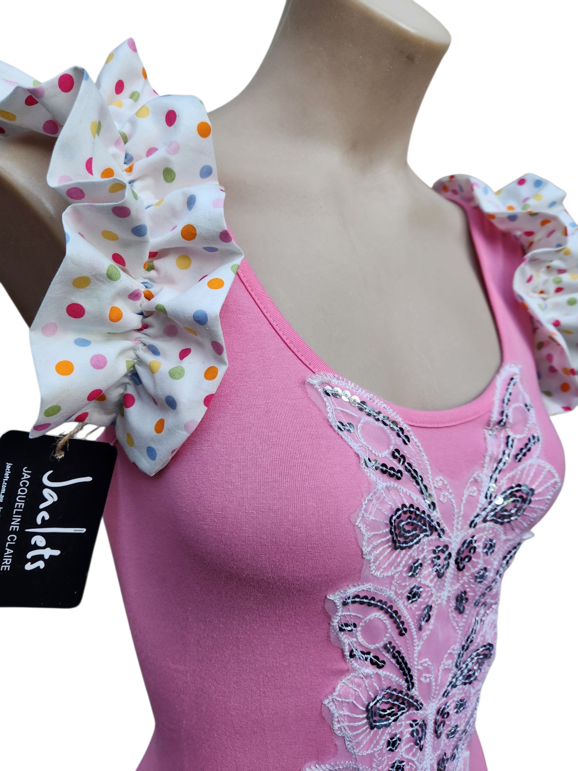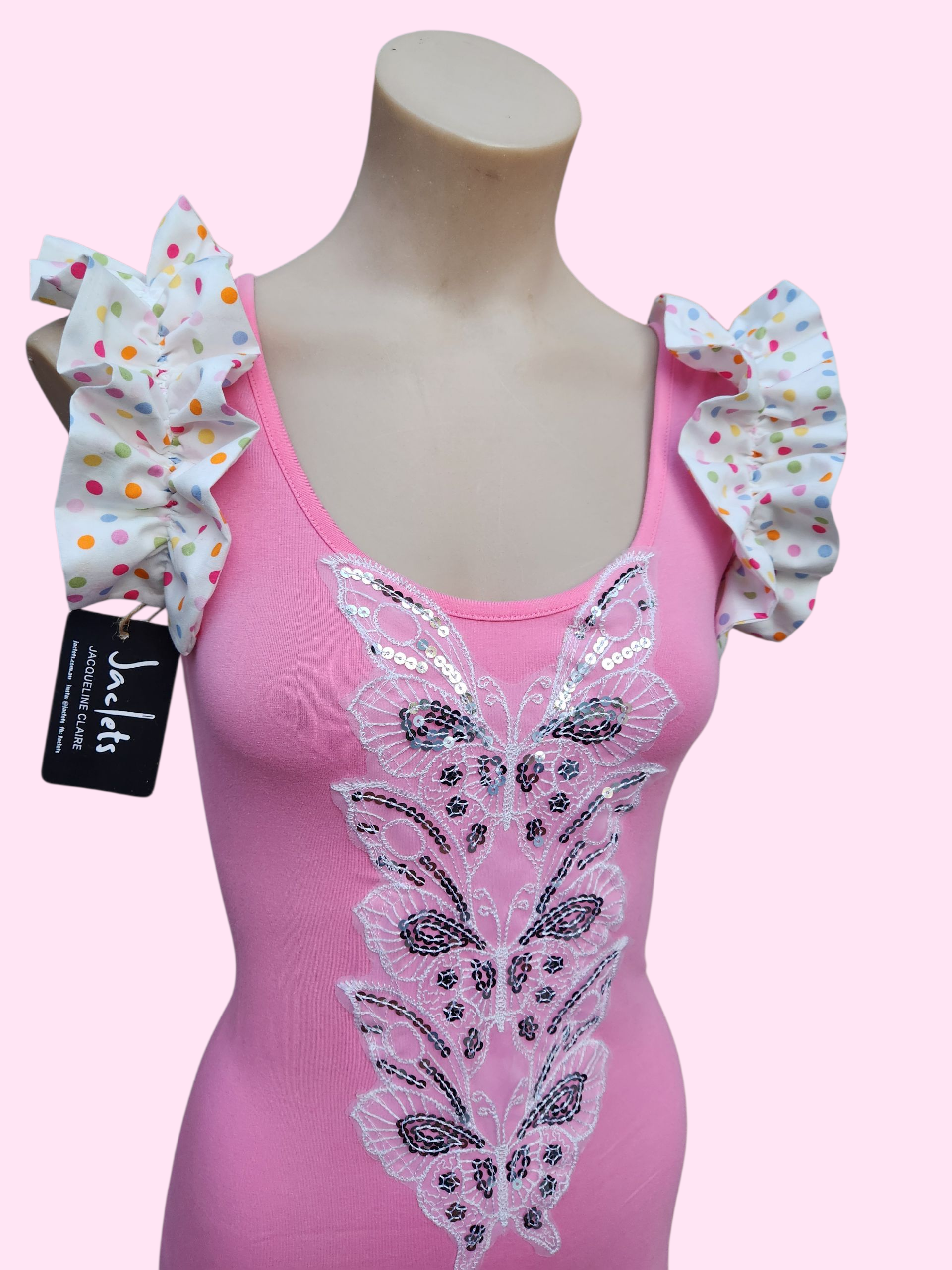 Each detail brings a burst of joy — from the soft pastel pink fabric to the colourful dot prints that are sprinkled on the ruffled sleeves. The front embroidery sparkles with delicate sequins shaped into whimsical butterflies, adding a touch of magic to your outfit.