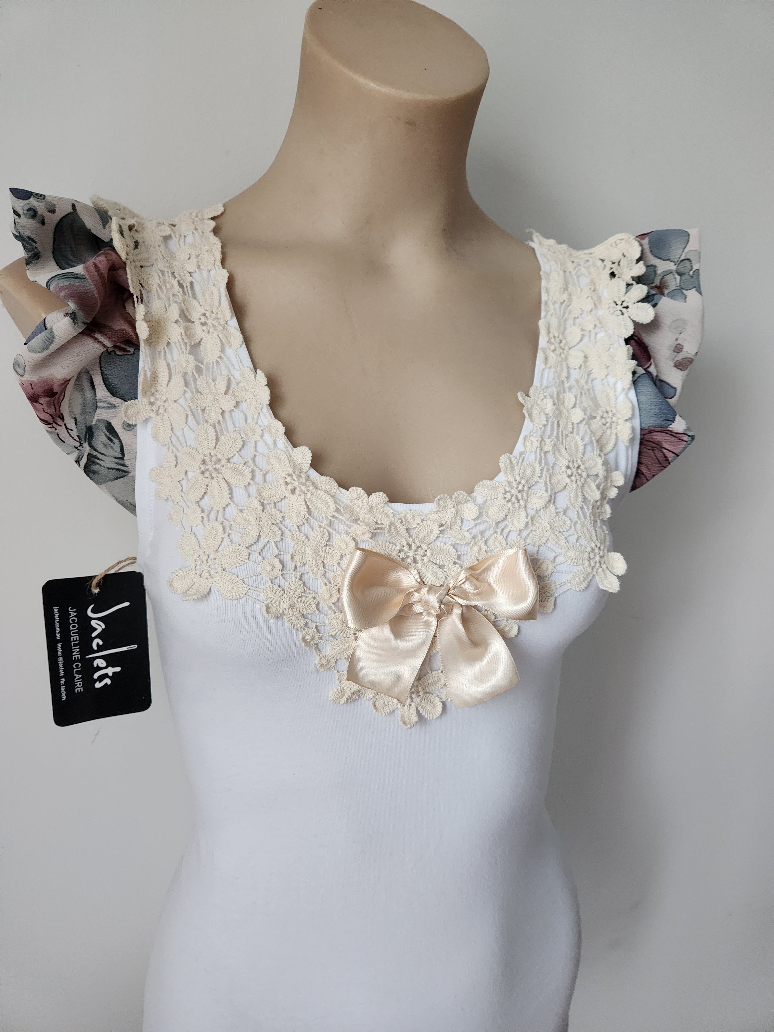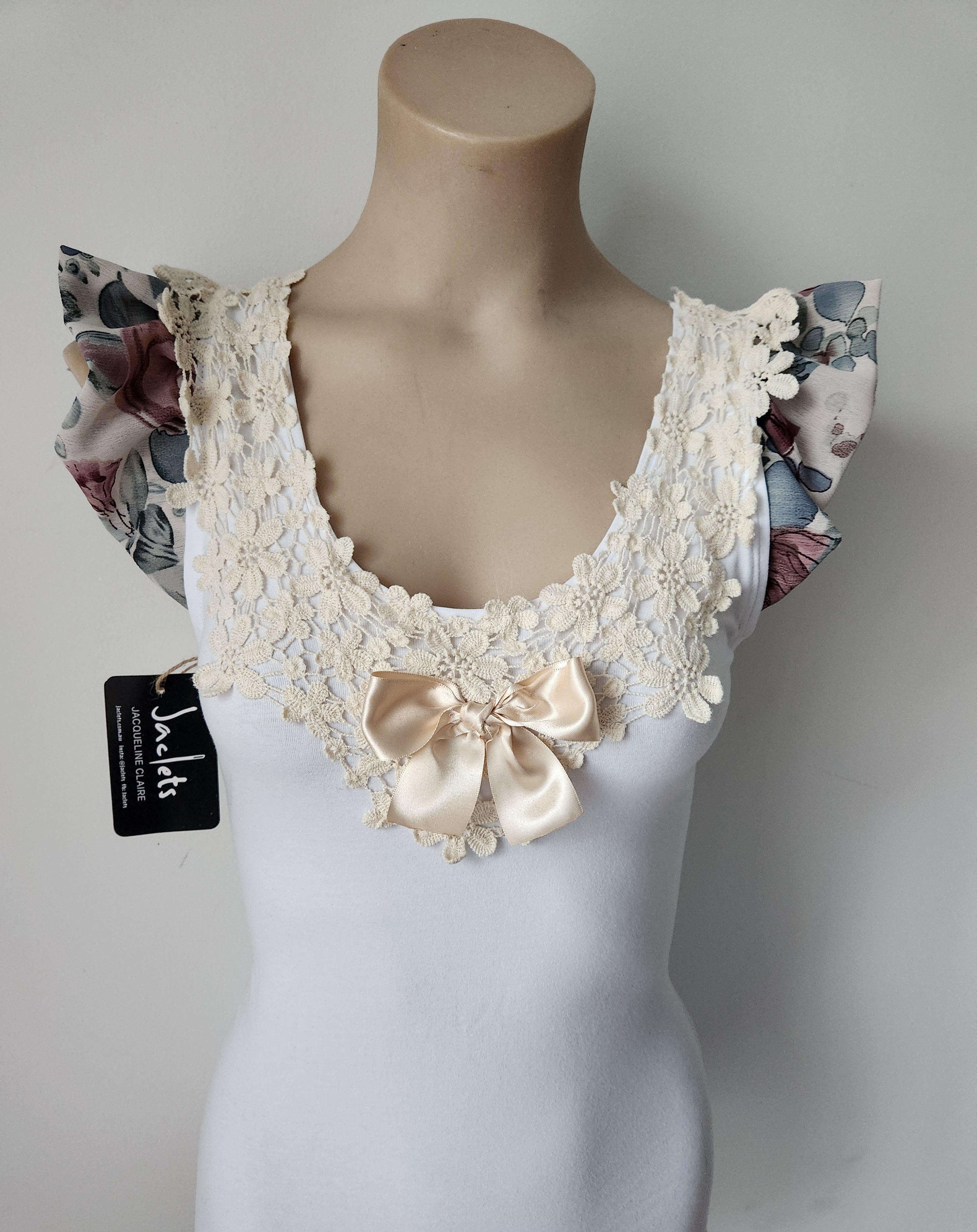 The flutter sleeves are made from lightweight floral fabric, softly ruffled to frame your shoulders and add movement with every step. Perfect for pairing with jeans, skirts, or layered under a jacket, this piece captures the signature Jaclets blend of creativity, comfort, and individuality.
